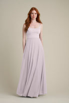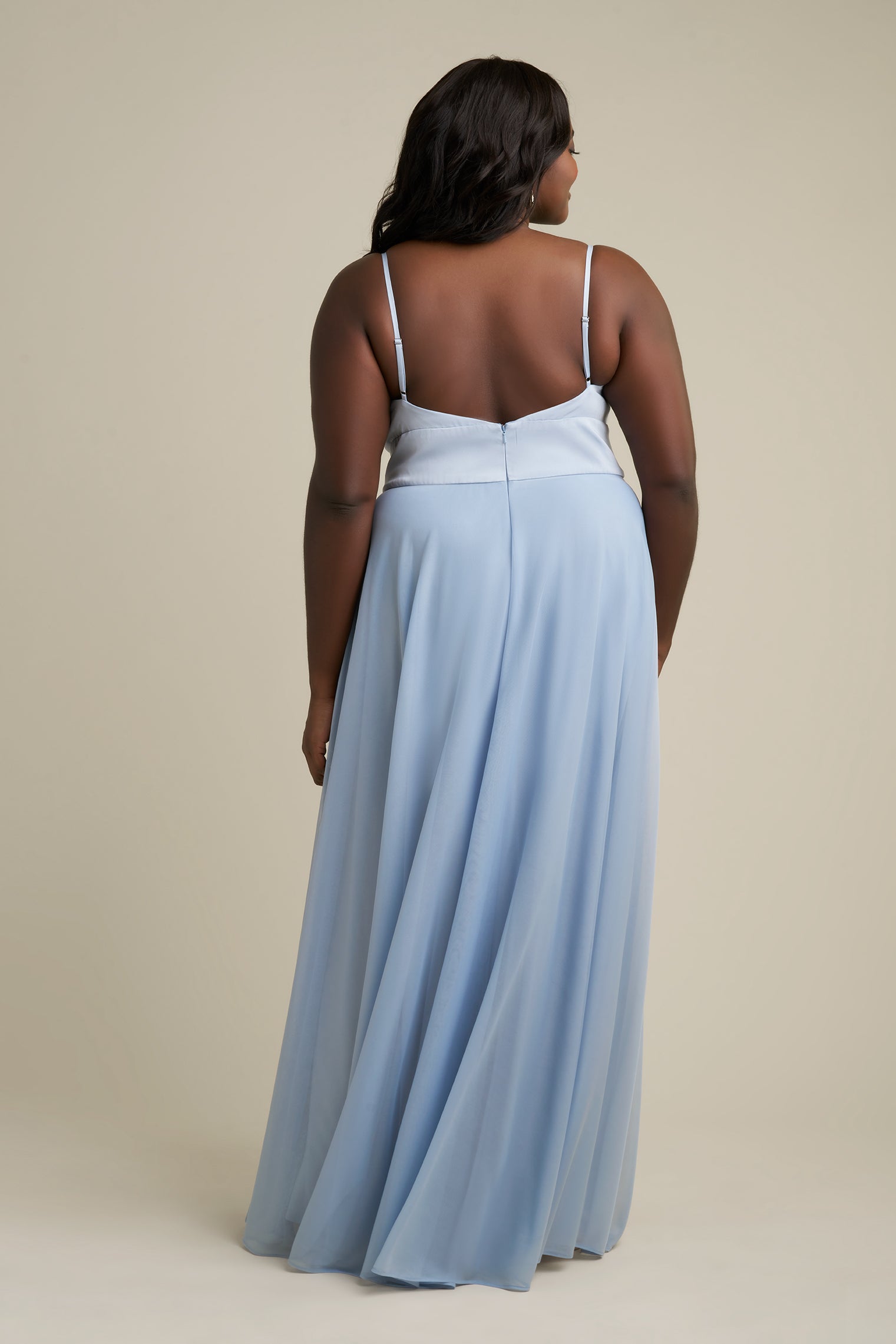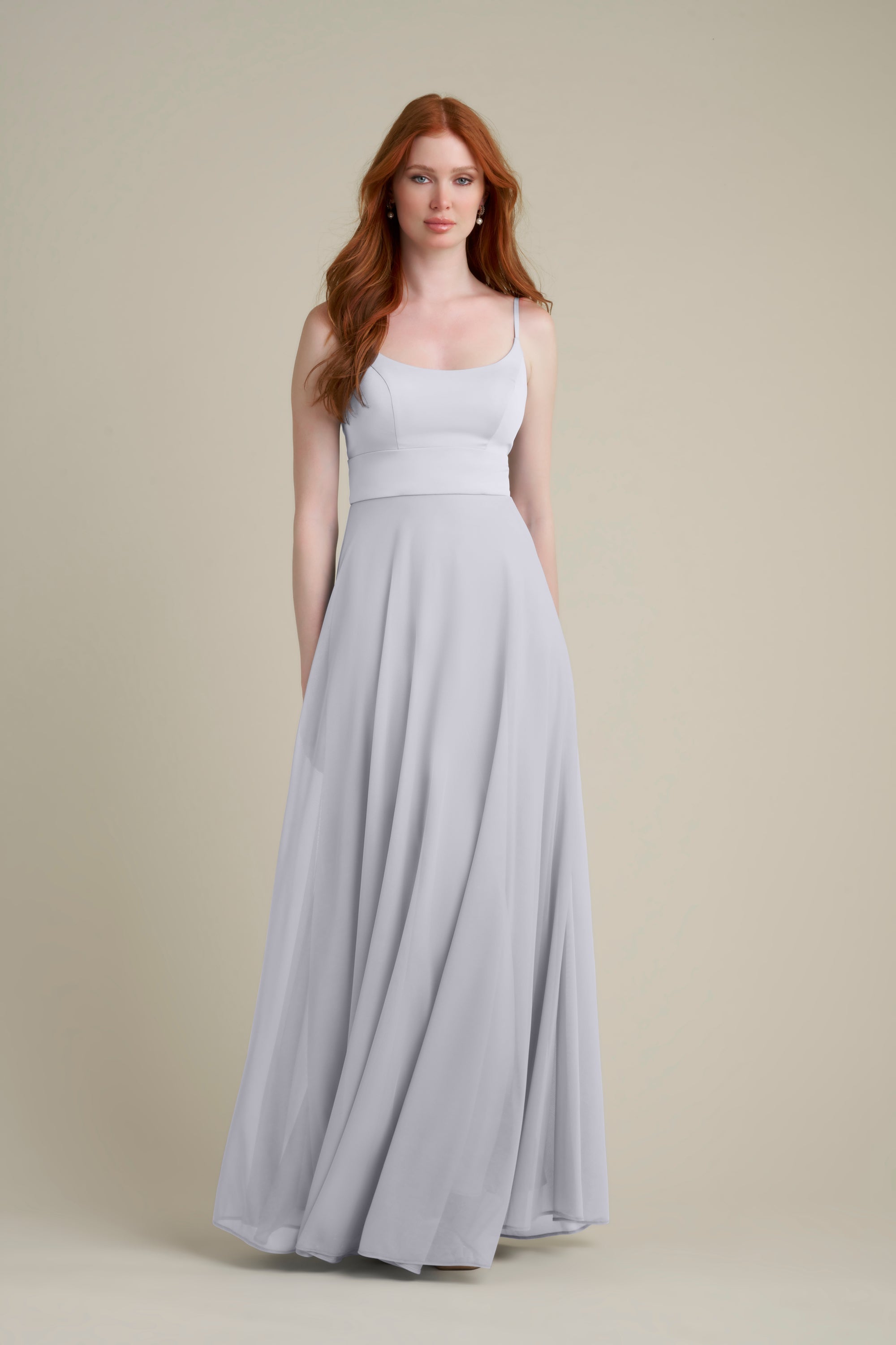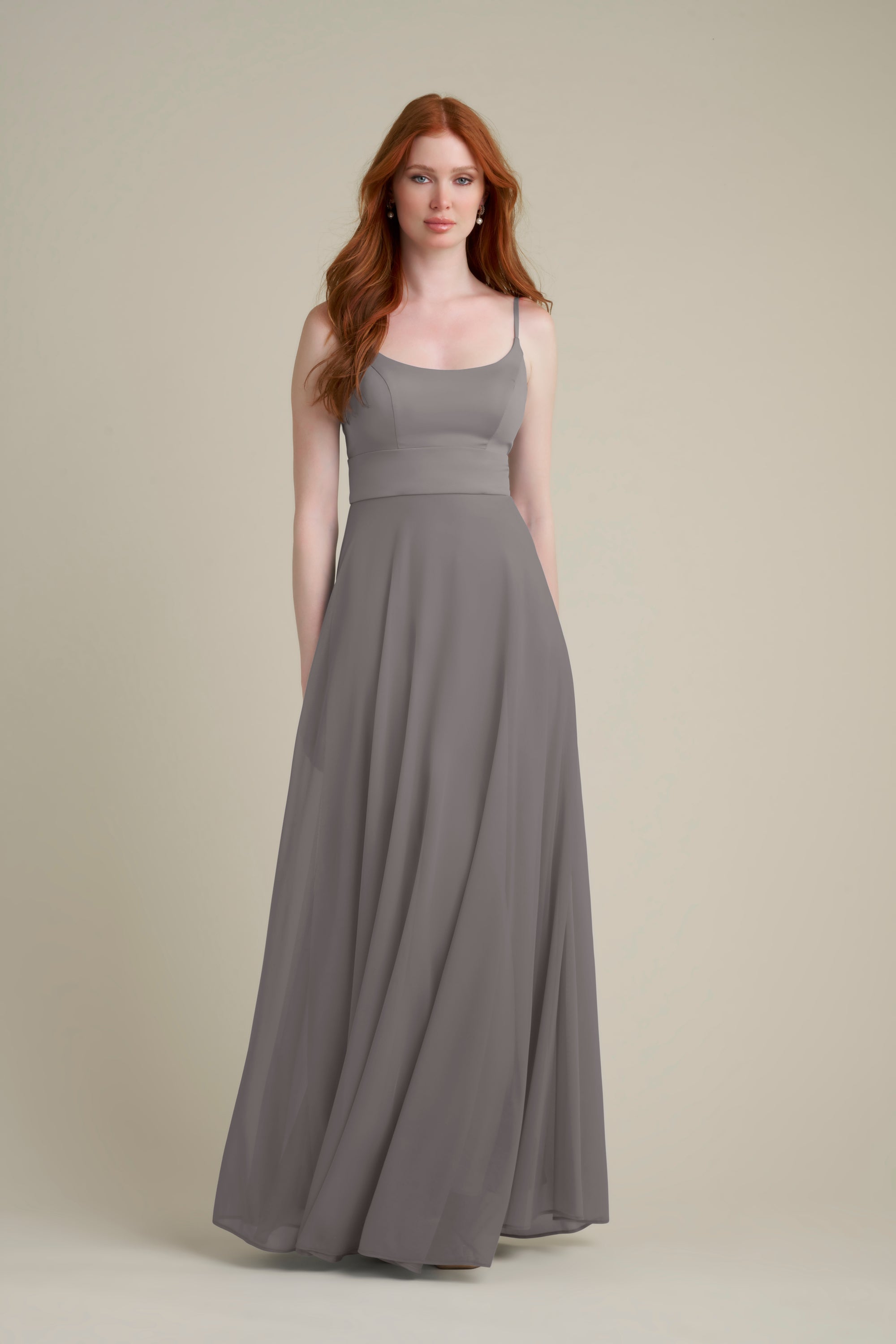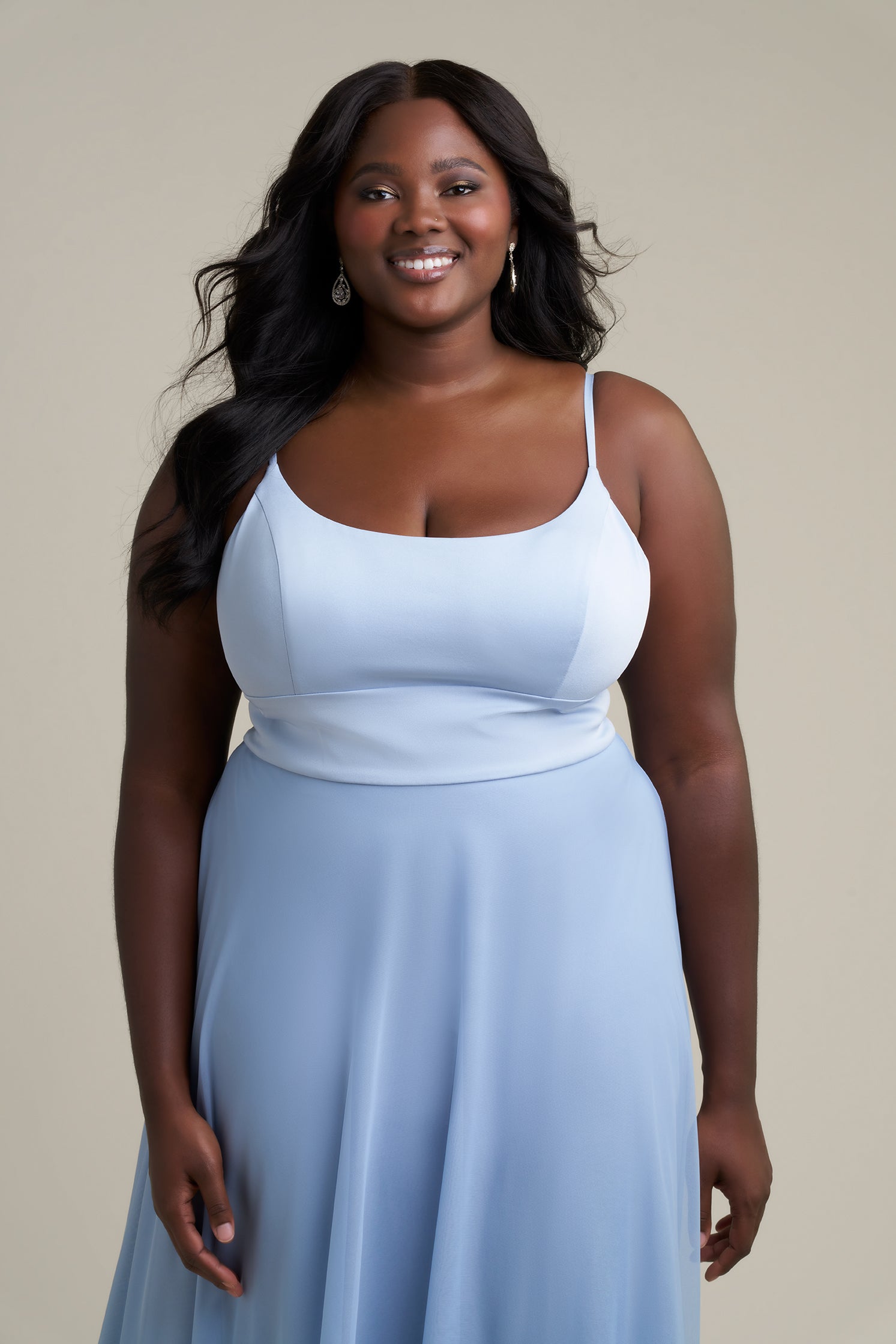 The lovely Agnes gown features a gorgeous pairing of textures and tones, with a stretch jersey bodice and fluid stretch chiffon skirt.