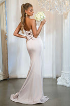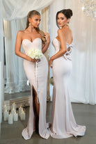 Introducing the Allie - a romantic and timeless choice for your bridesmaids. This strapless, form-fitting design features a flattering sweetheart-shaped bodice and a subtle slit for added elegance. Delicate straps with bows at the back, along with a detachable bow at the top of the zipper, bring a playful, feminine touch that‚ are perfect for your special day. Crafted from luxurious stretch satin fabric, the Allie combines comfort and charm, ensuring your bridesmaids will look and feel their best while adding a romantic flair to your celebration