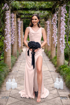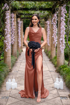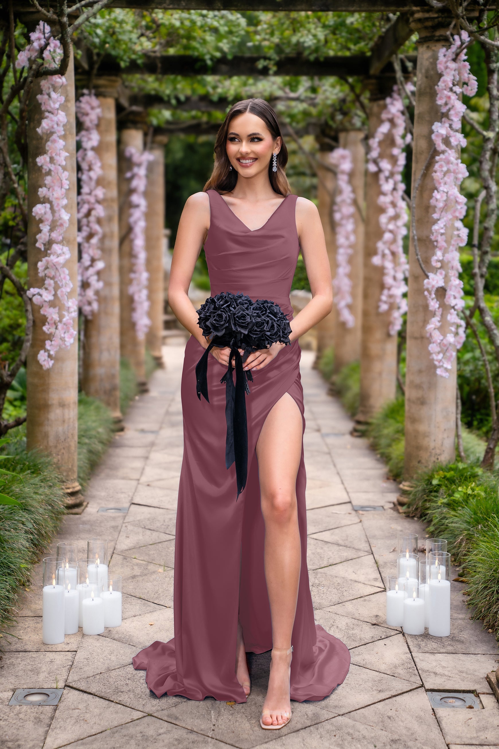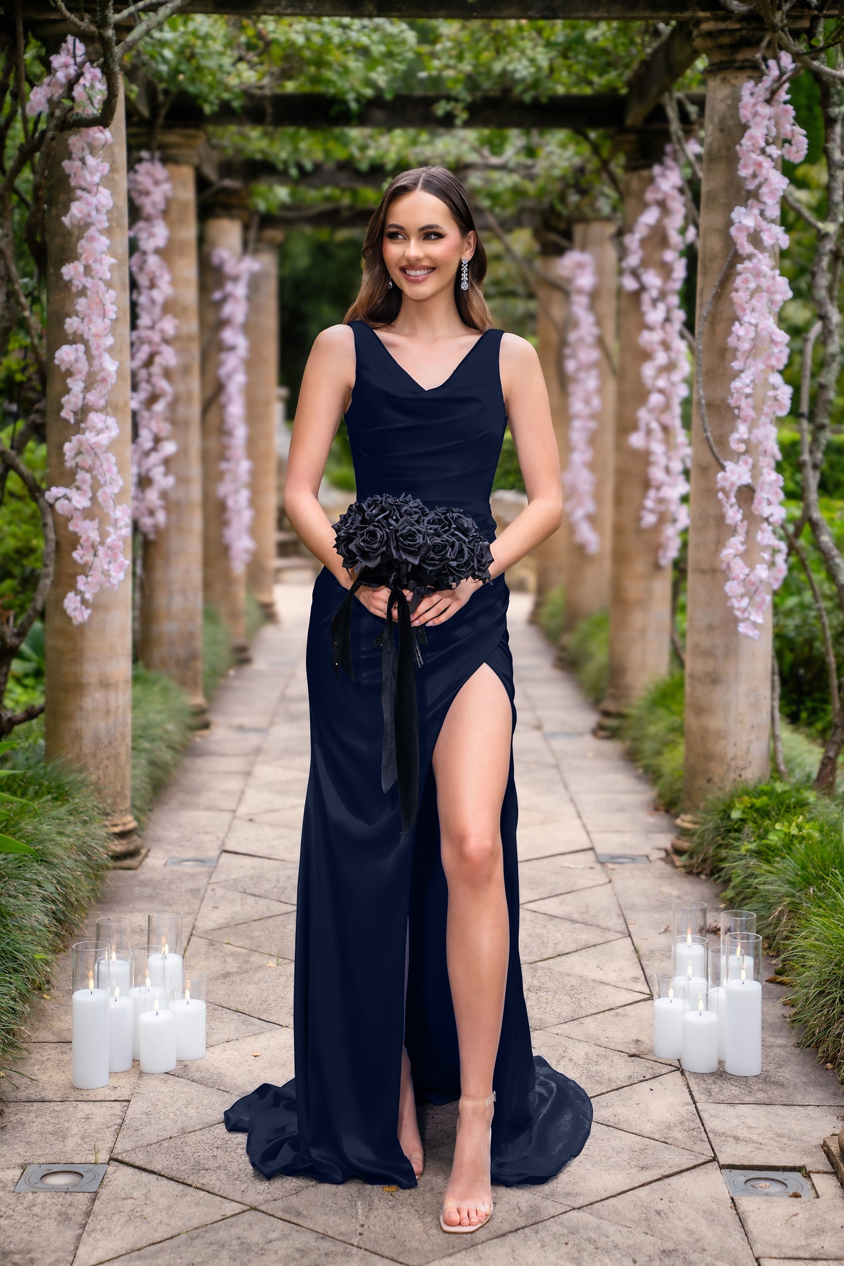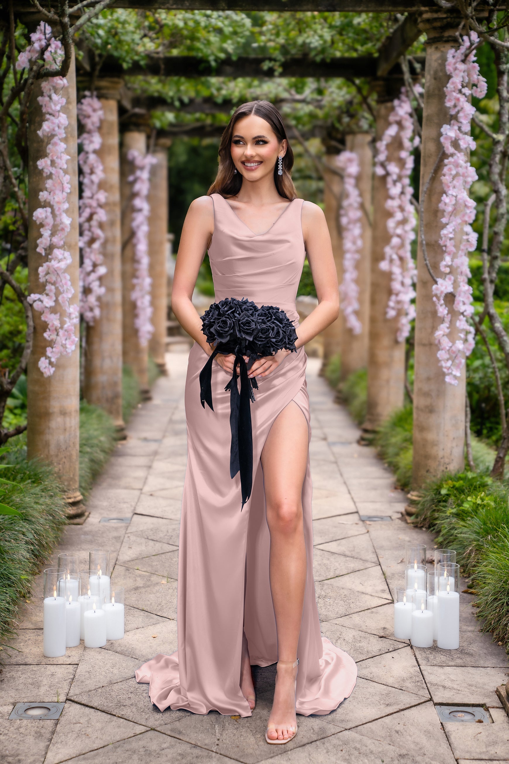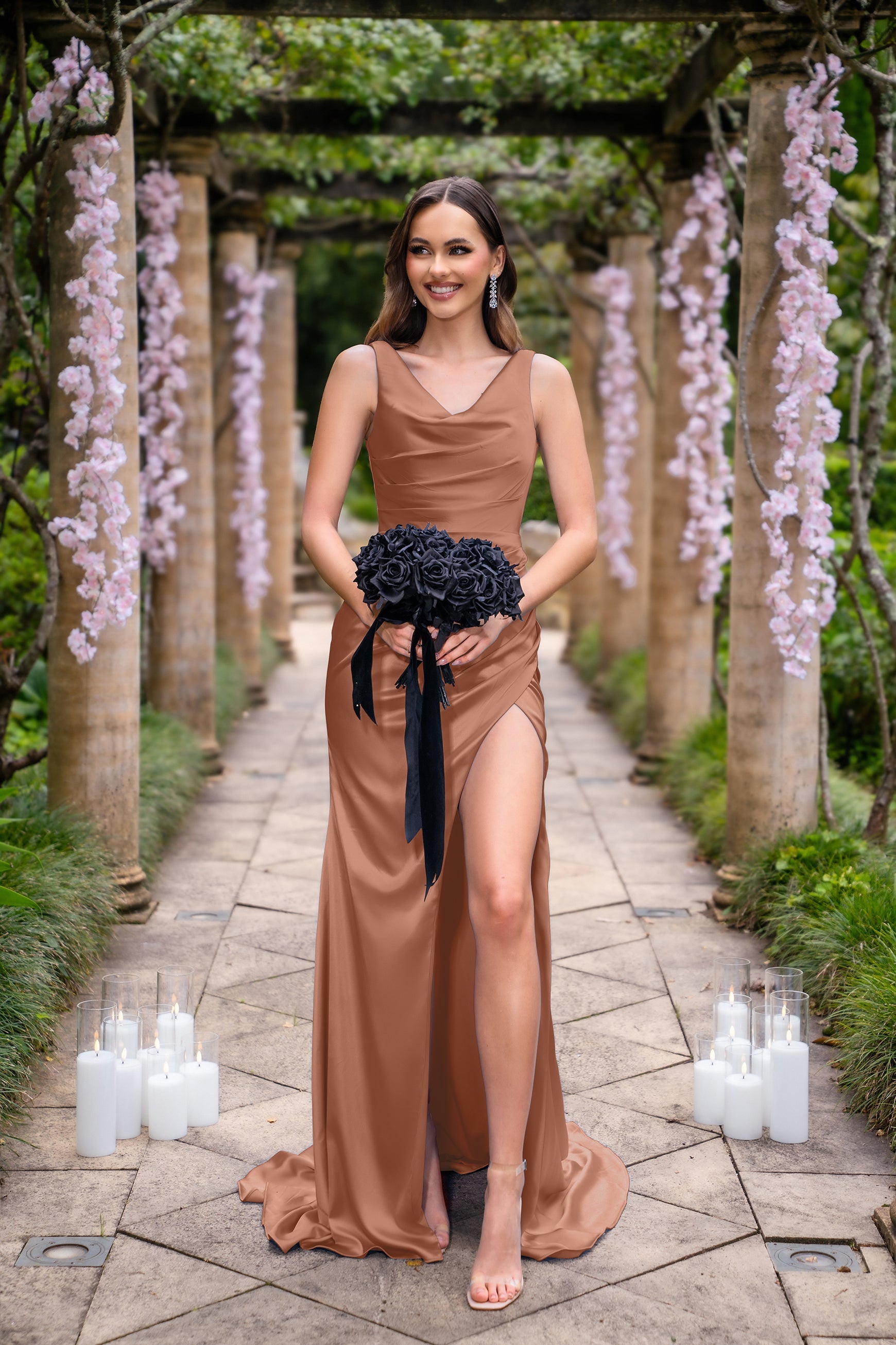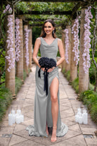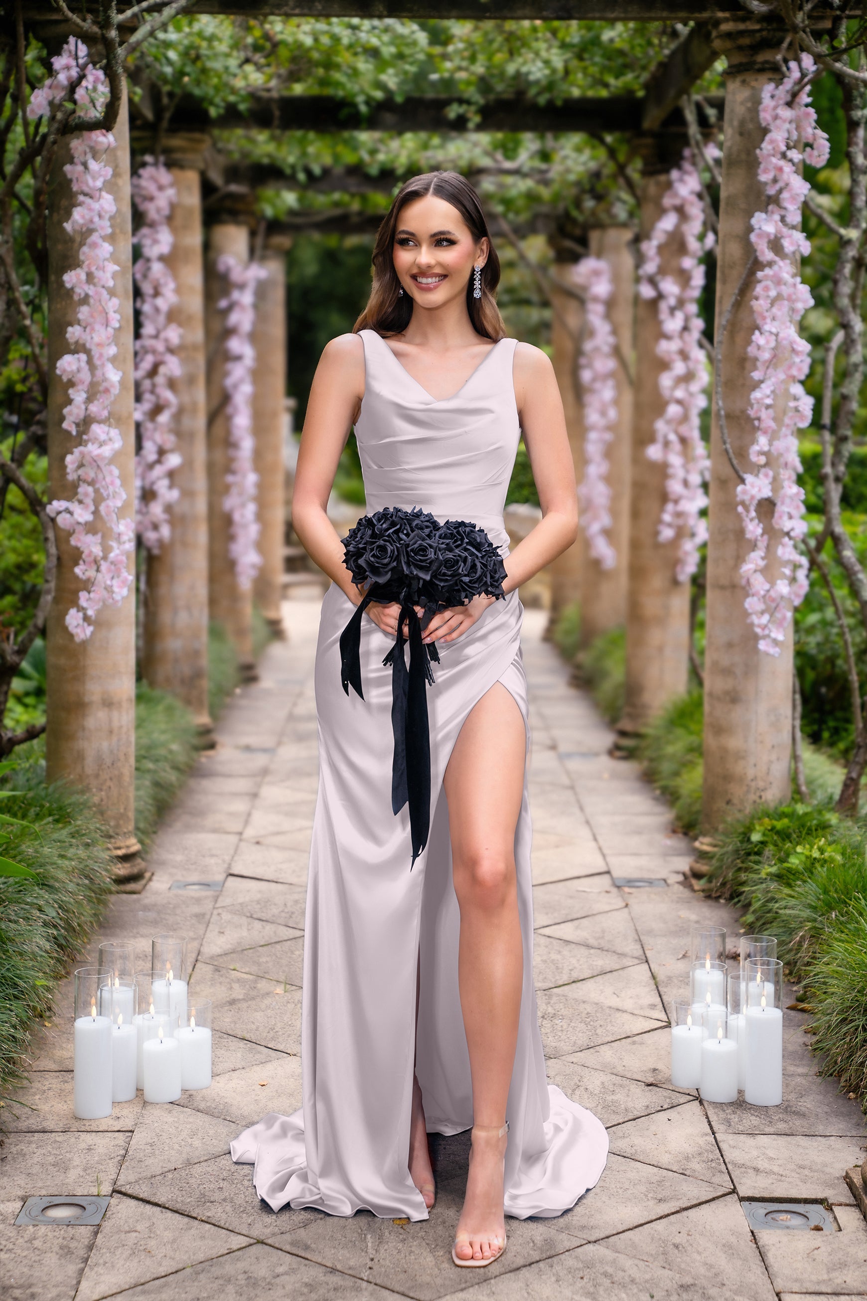 Introducing the stunning Amelia‚ is a perfect choice for bridesmaids who want to shine on that special day. This elegant dress features a beautifully crafted V-front rouged bodice that flatters every figure, complemented by exquisite ruching at the waist to create a sophisticated silhouette. The high slit adds a daring touch, while the short train at the back ensures a graceful exit as you make your way down the aisle. The Amelia offers a tailored fit that enhances your natural curves, making it a timeless and elegant choice for any wedding celebration. Elevate your bridesmaid experience in this enchanting gown!