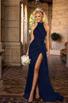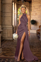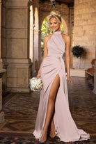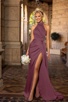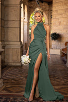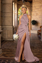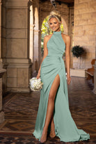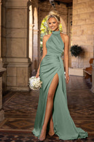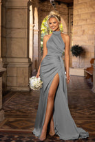 Introducing the stunning Aricia, the epitome of elegance for your special day! This high-neck silk gown boasts a dramatic high slit and a gracefully draped side skirt, creating a silhouette that flatters every figure. The exquisite ruching at the waist and subtly at the hips adds a touch of sophistication, while the sweeping train at the back enhances the gown's romantic allure. Designed for those who appreciate timeless beauty, the Aricia will ensure your bridesmaids look and feel their absolute best as they celebrate alongside you. Perfect for both the ceremony and the dance floor, this gown promises to be a showstopper!