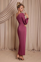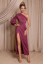 The Blake Dress is made from soft stretch satin and features a one-shoulder neckline with a statement puff sleeve. The fitted bodice and pleated waistband highlight the waist, while the wrap-style skirt with a high split adds a modern edge. A sleek and confident choice for bridesmaids wanting a contemporary silhouette.