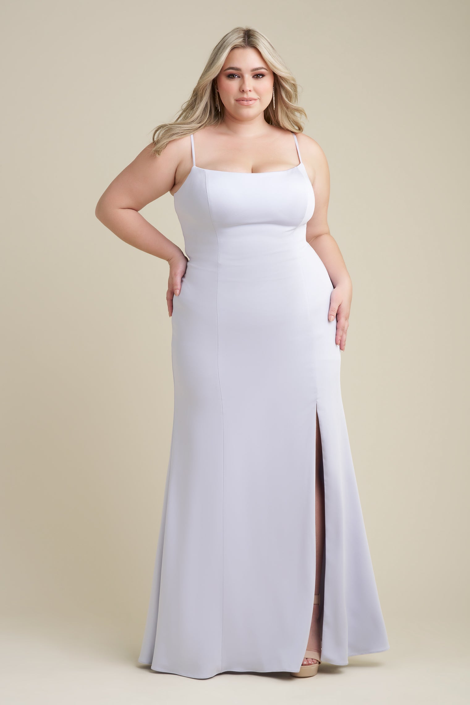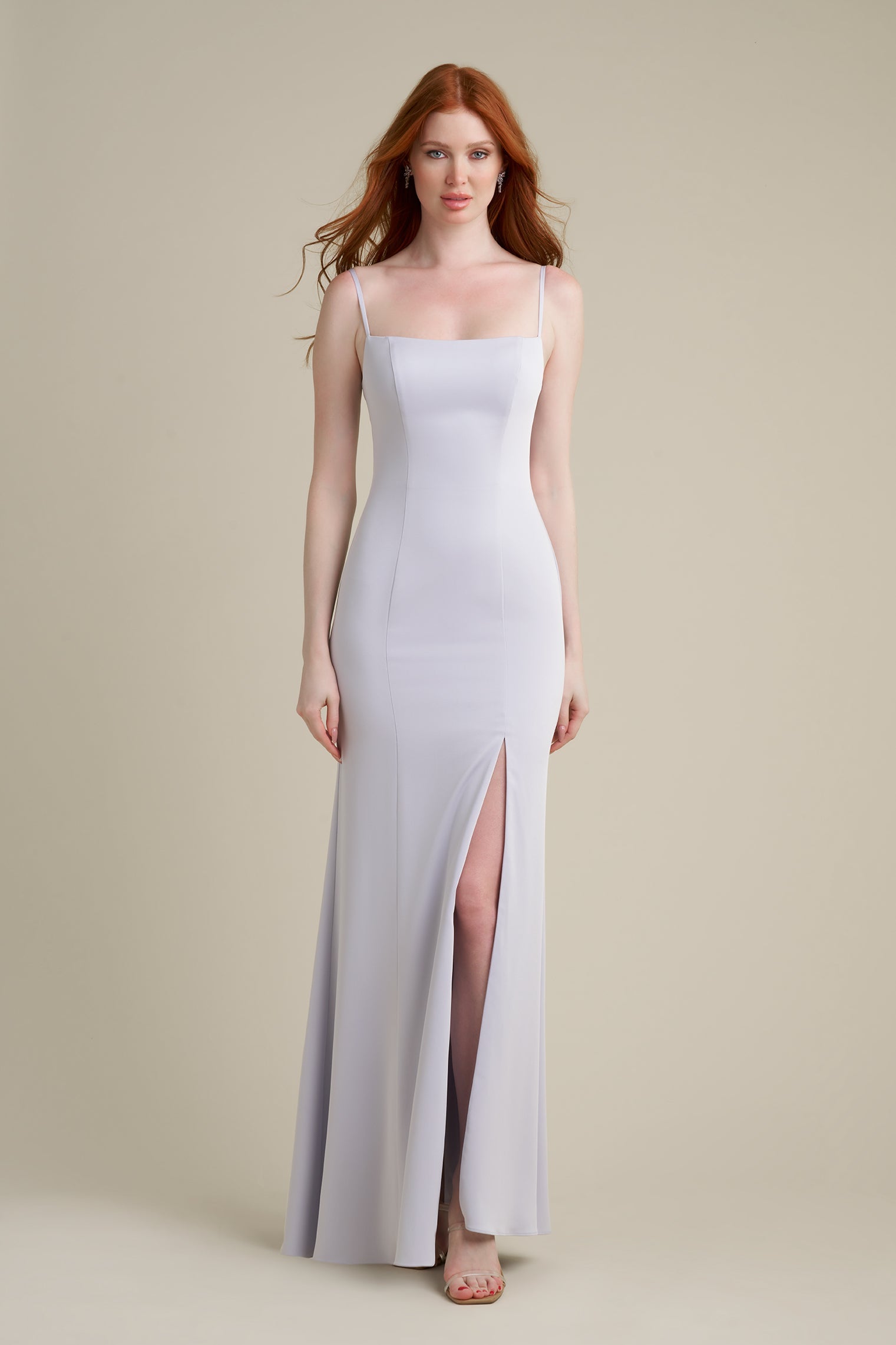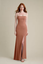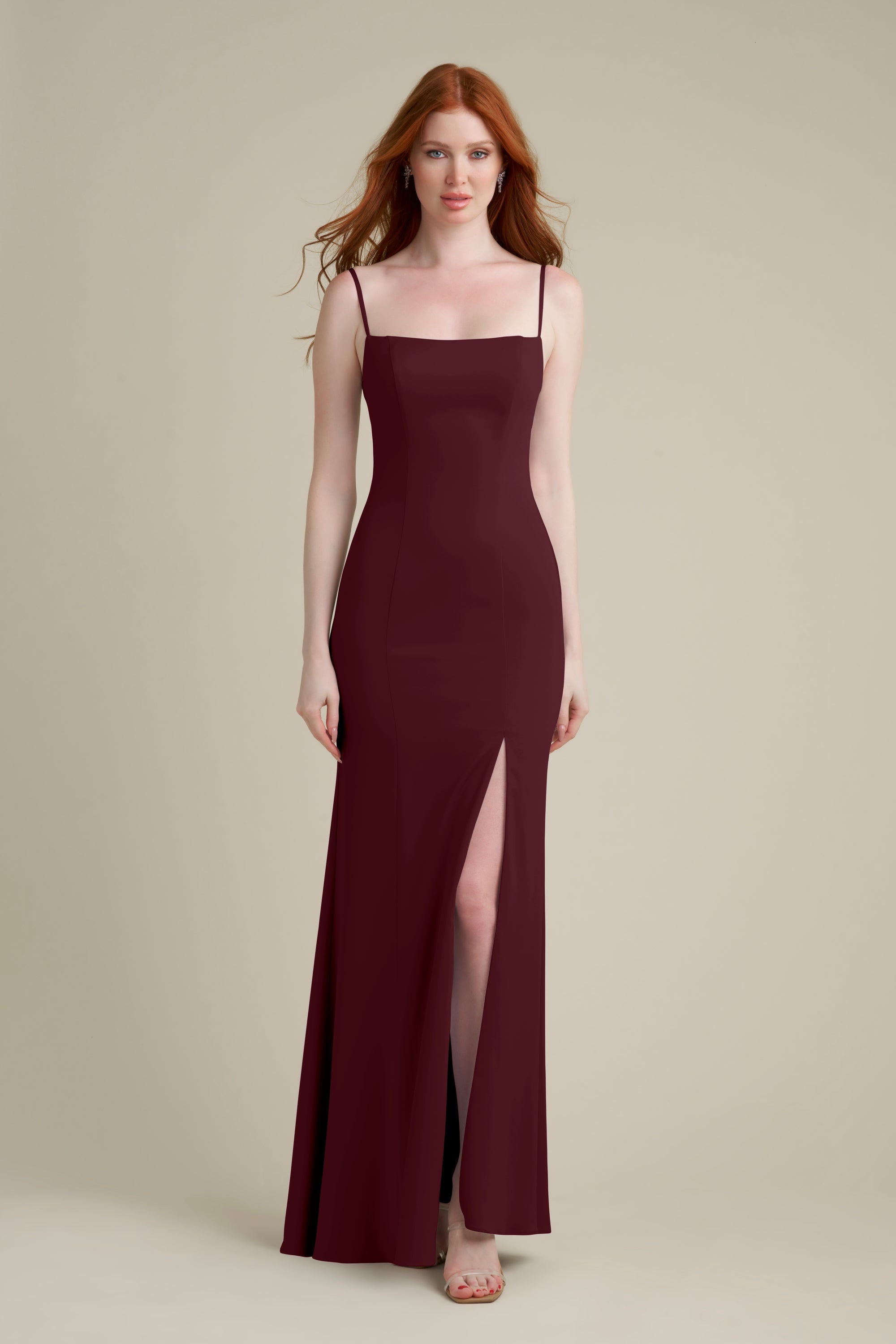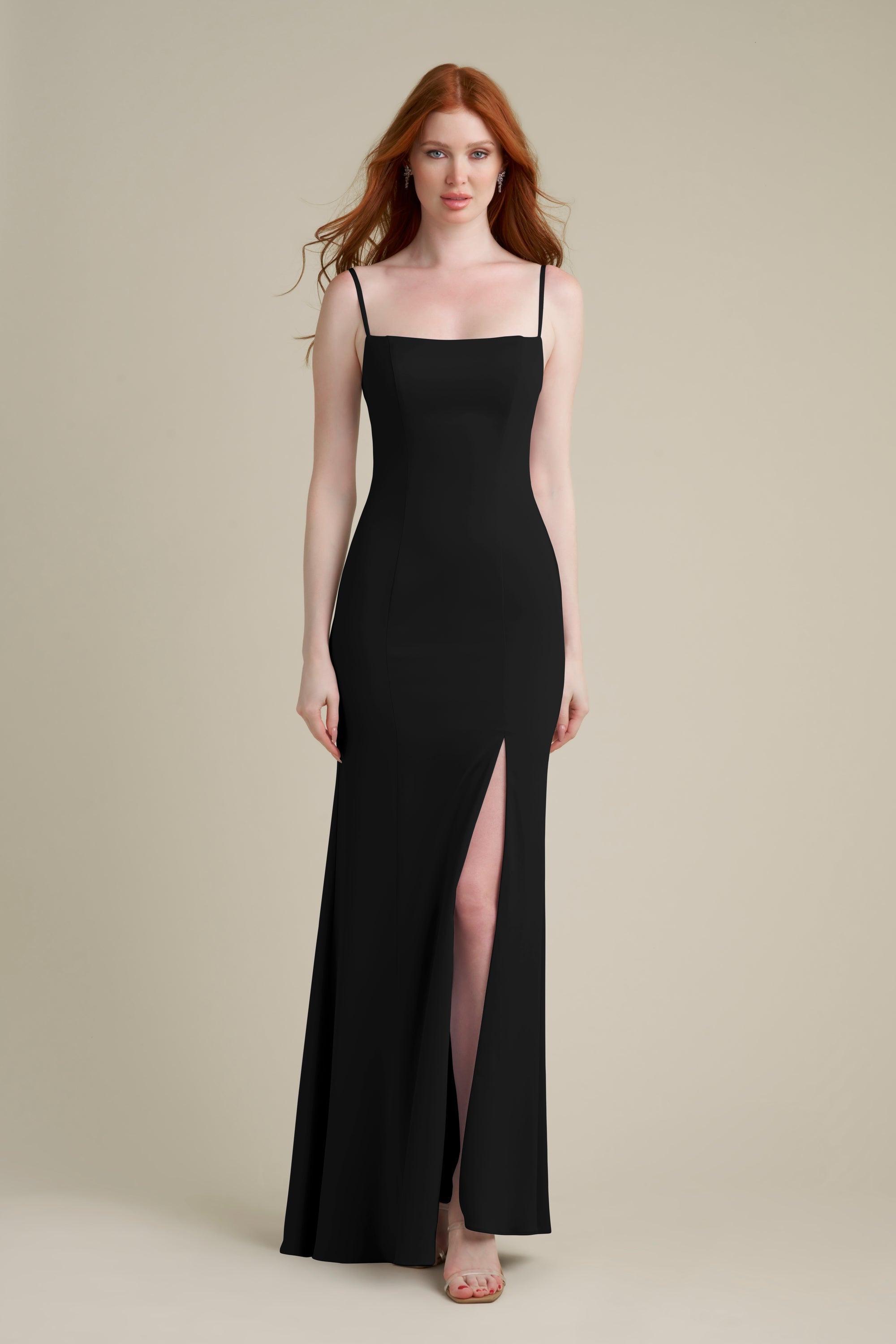 Stunning Ayn features a form-fitting sheath, squared neckline and spaghetti straps.