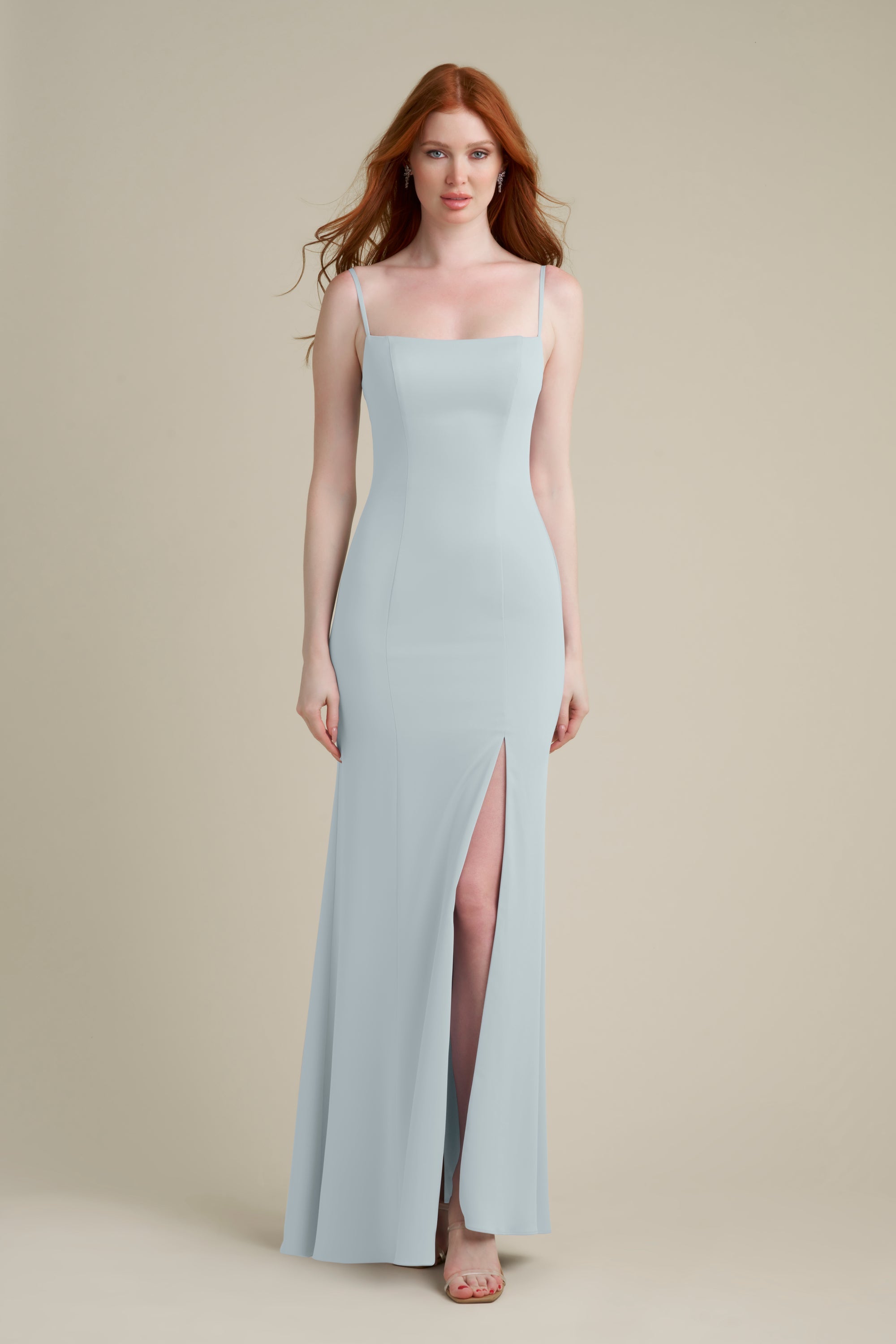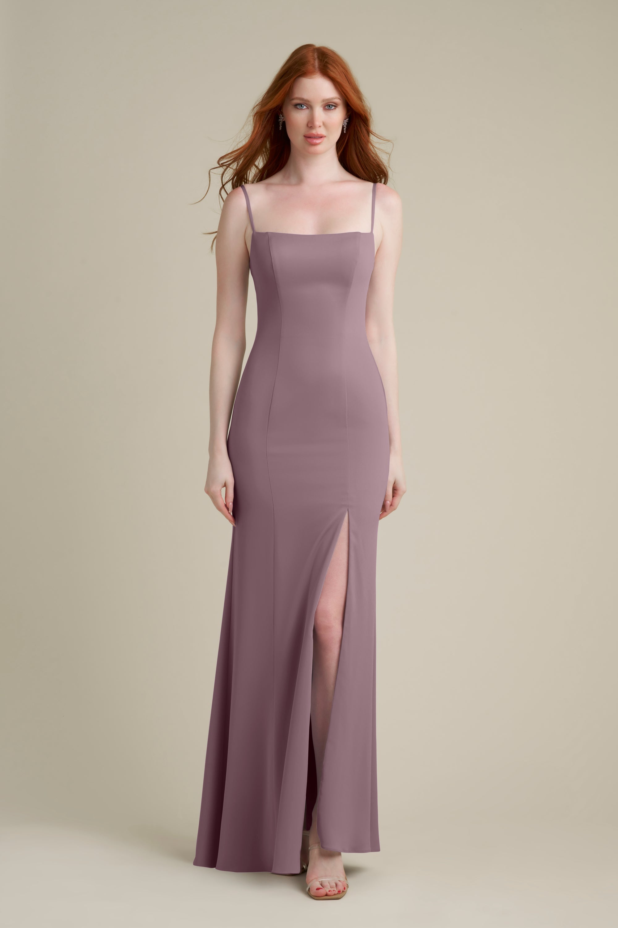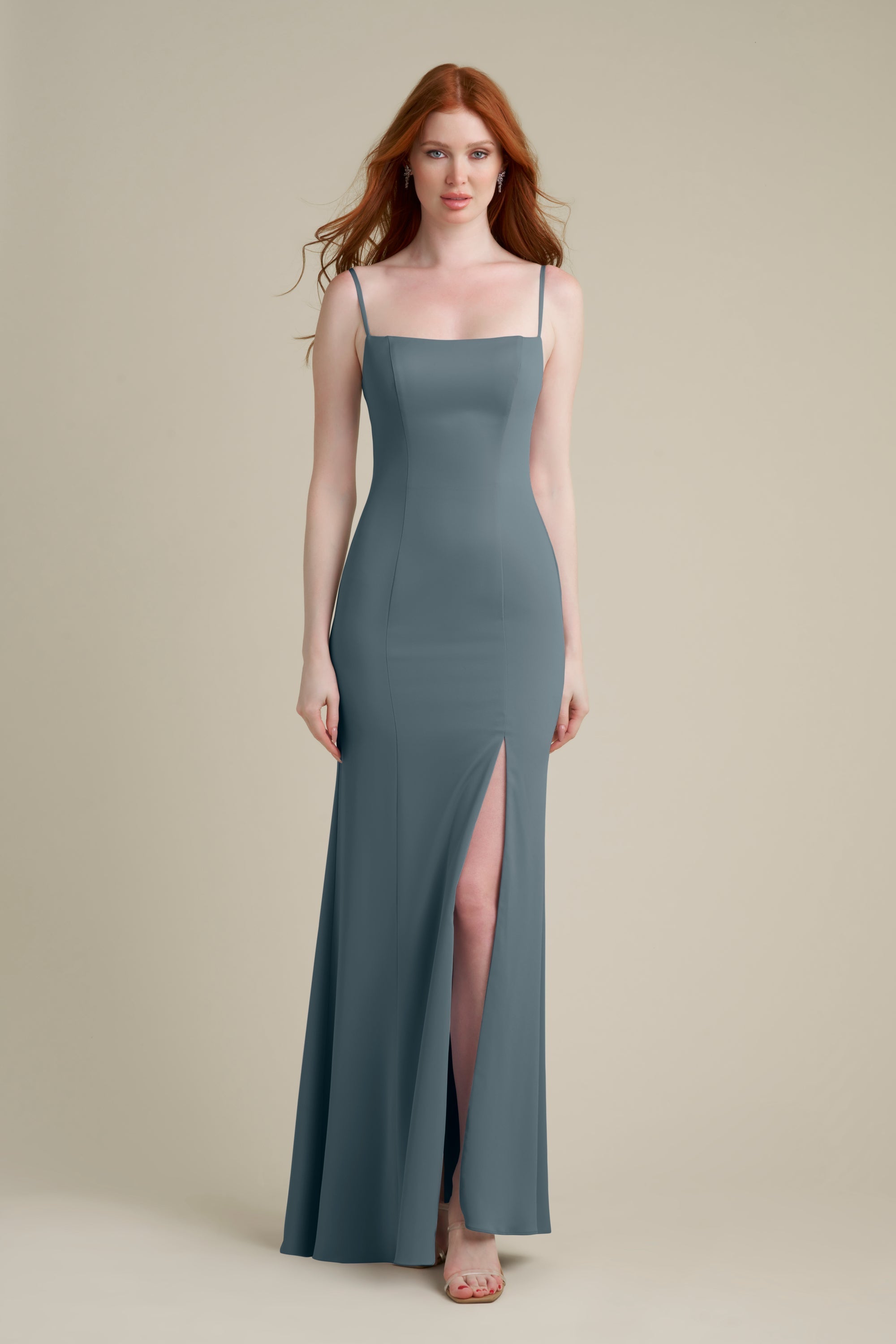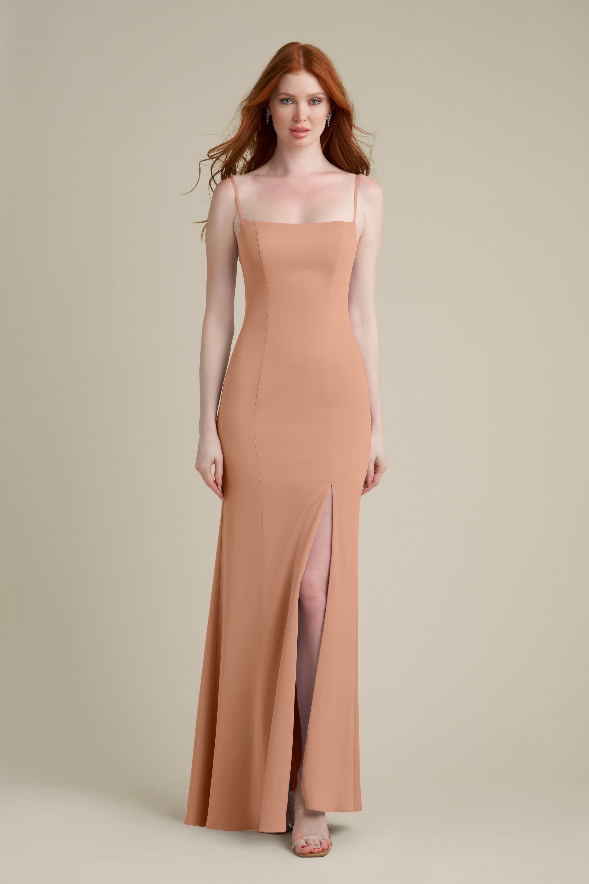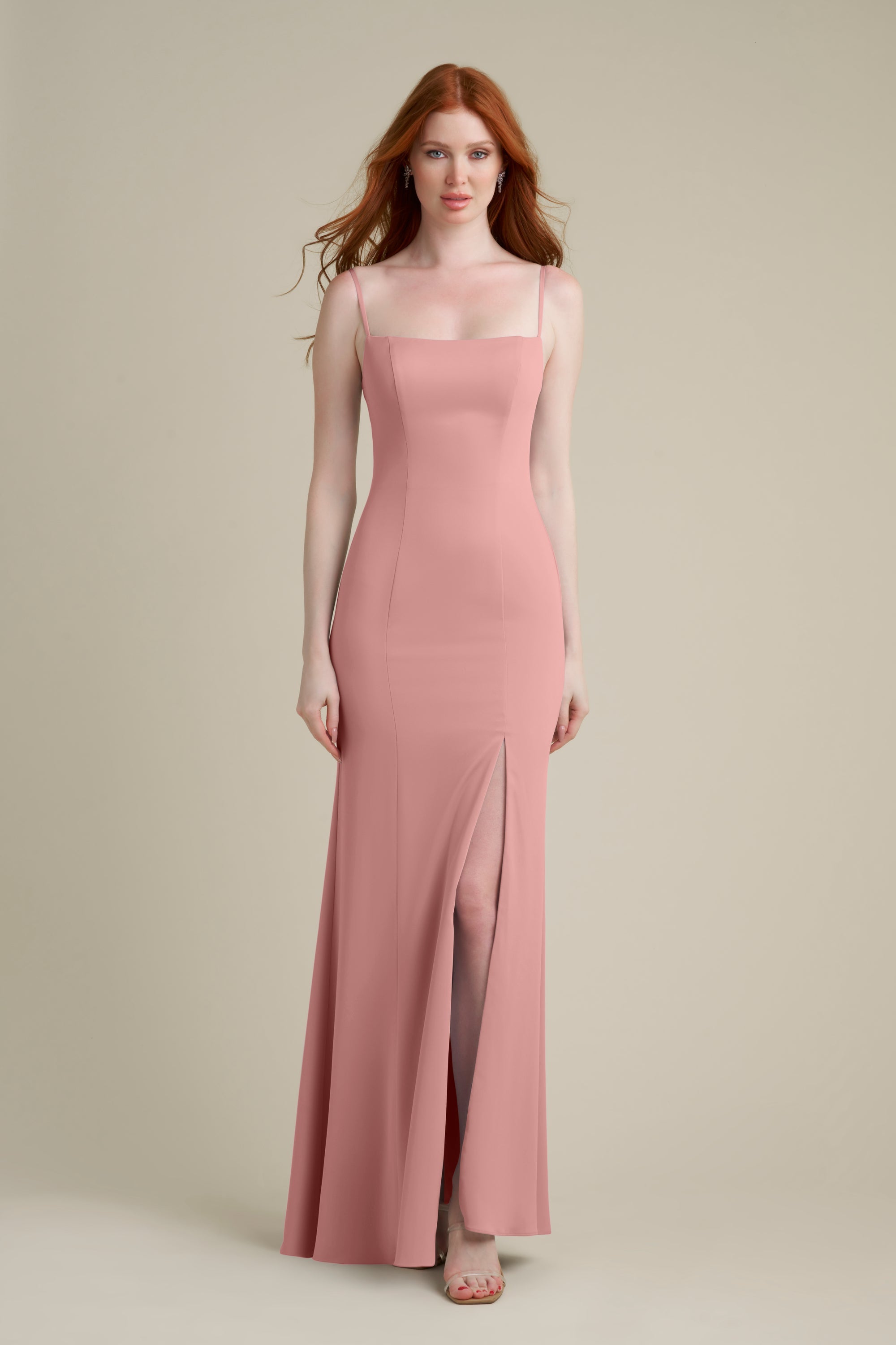 Stunning Ayn features a form-fitting sheath, squared neckline and spaghetti straps.