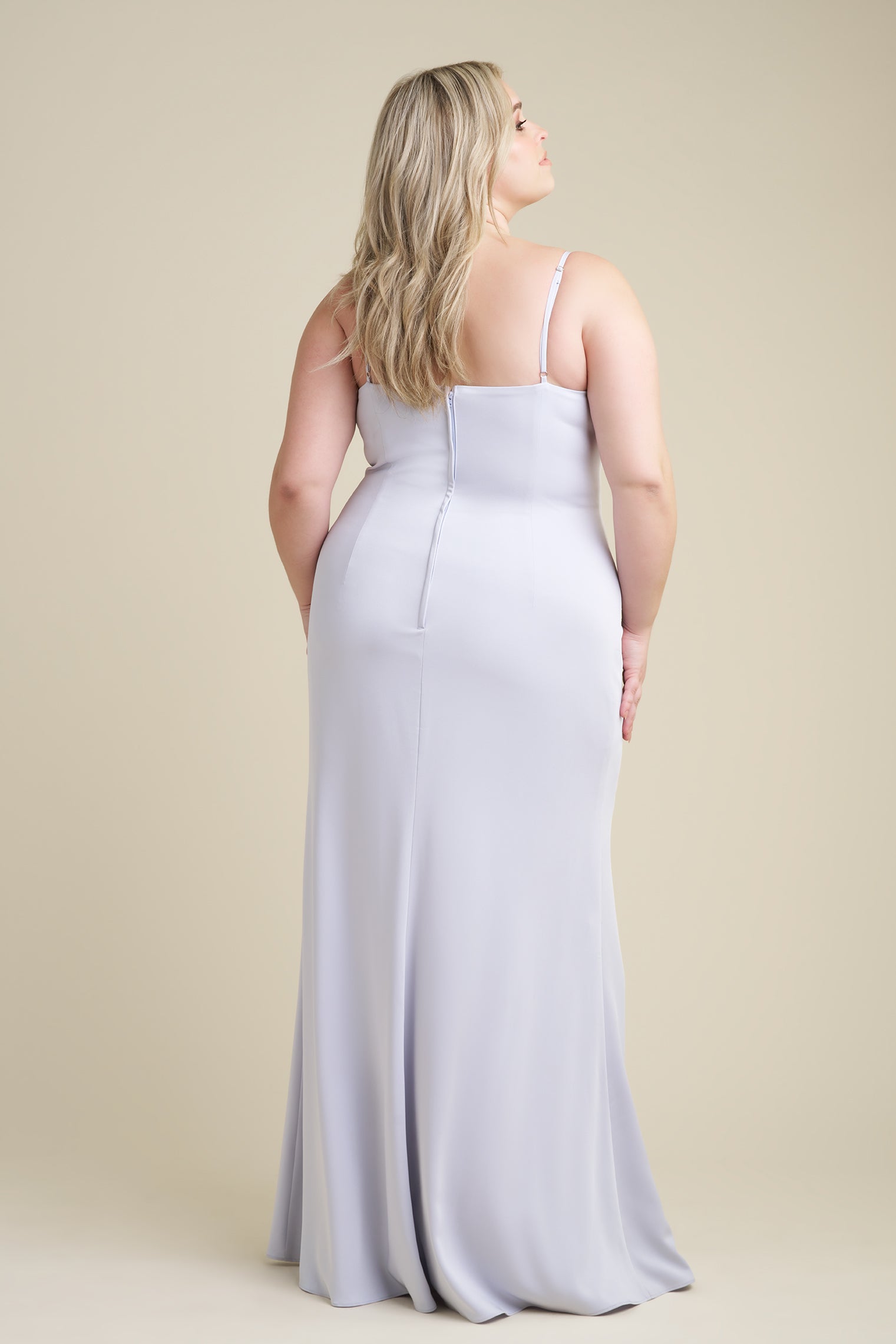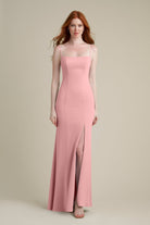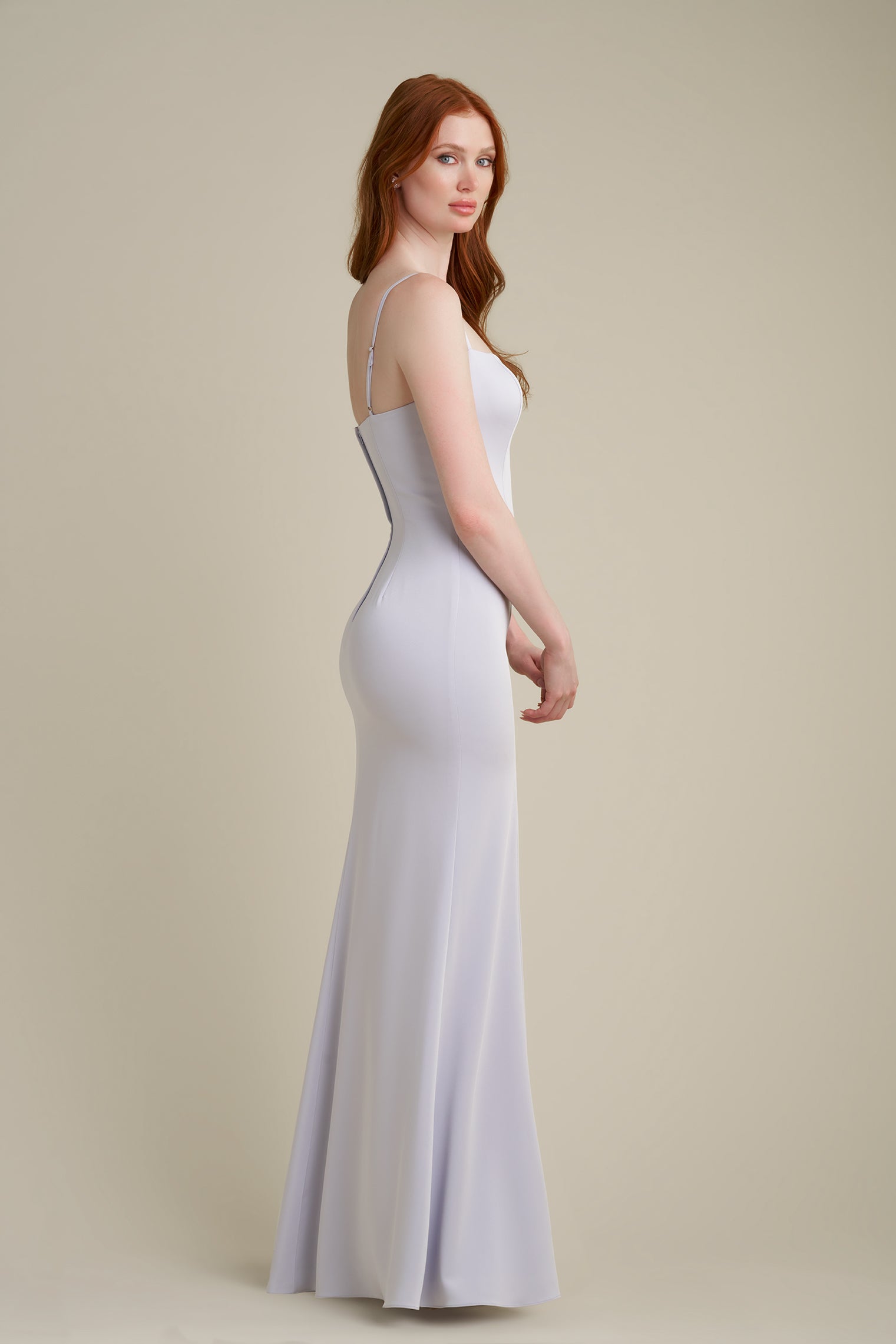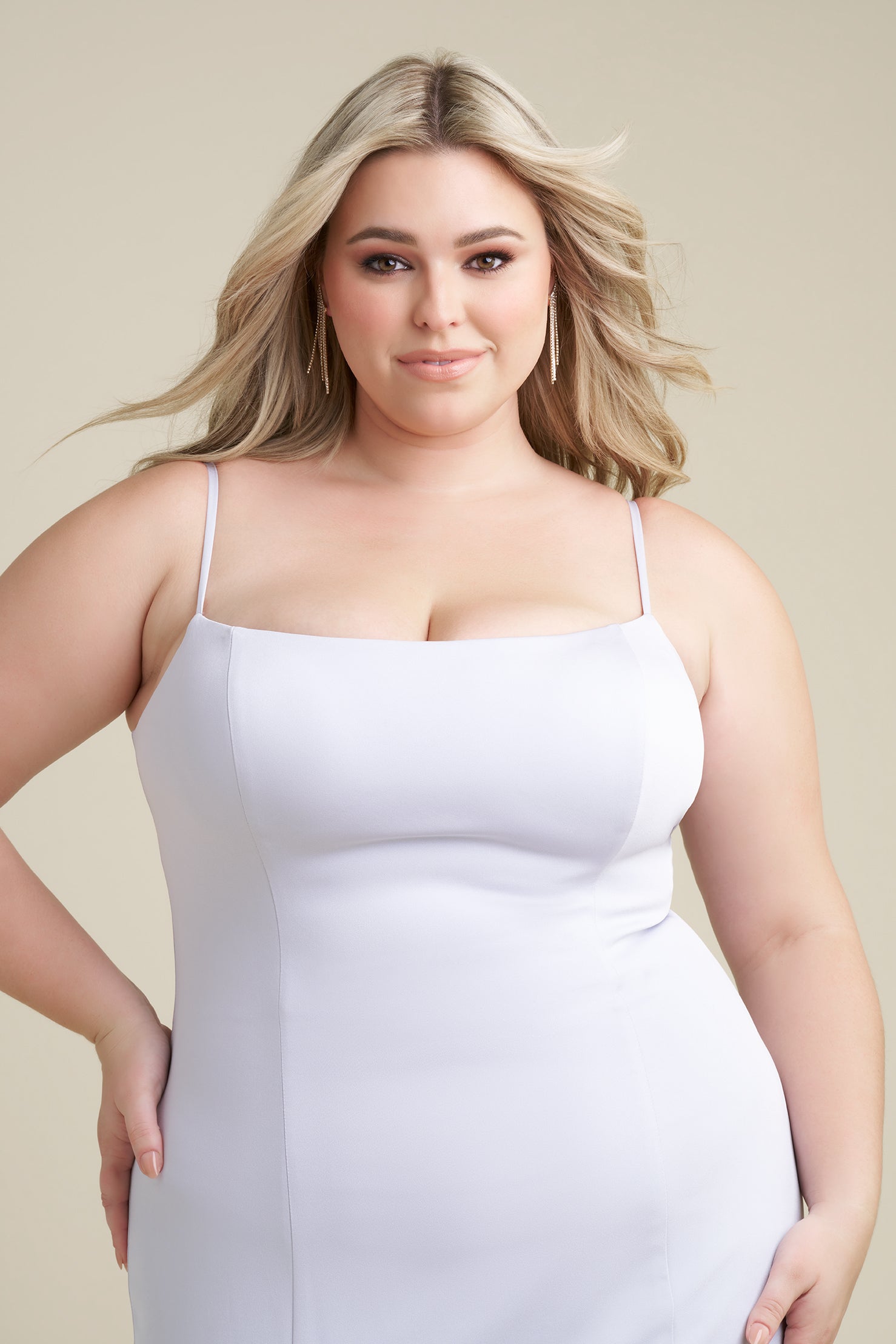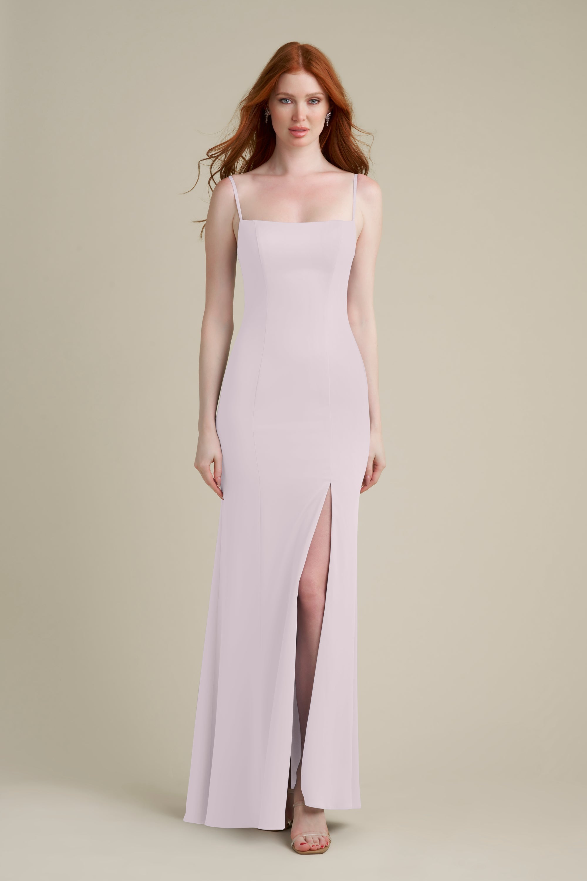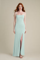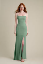 Stunning Ayn features a form-fitting sheath, squared neckline and spaghetti straps.