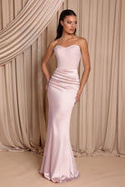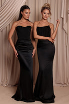 The Bailey Gown features a structured jersey bodice with visible seam detailing and a smooth satin skirt that drapes elegantly to the floor. Soft ruching at the hips enhances the silhouette, while the slight stretch ensures a comfortable fit. A sleek and modern option for bridesmaids who love a minimalist, refined look.