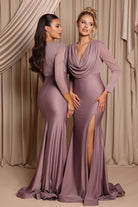 The Chloe Gown features a soft chiffon bodice with a draped cowl neckline and sheer long sleeves, paired with a sleek jersey skirt that hugs the figure. Finished with a thigh-high split and small train, this gown blends elegance with modern sophistication — perfect for bridesmaids or evening occasions.