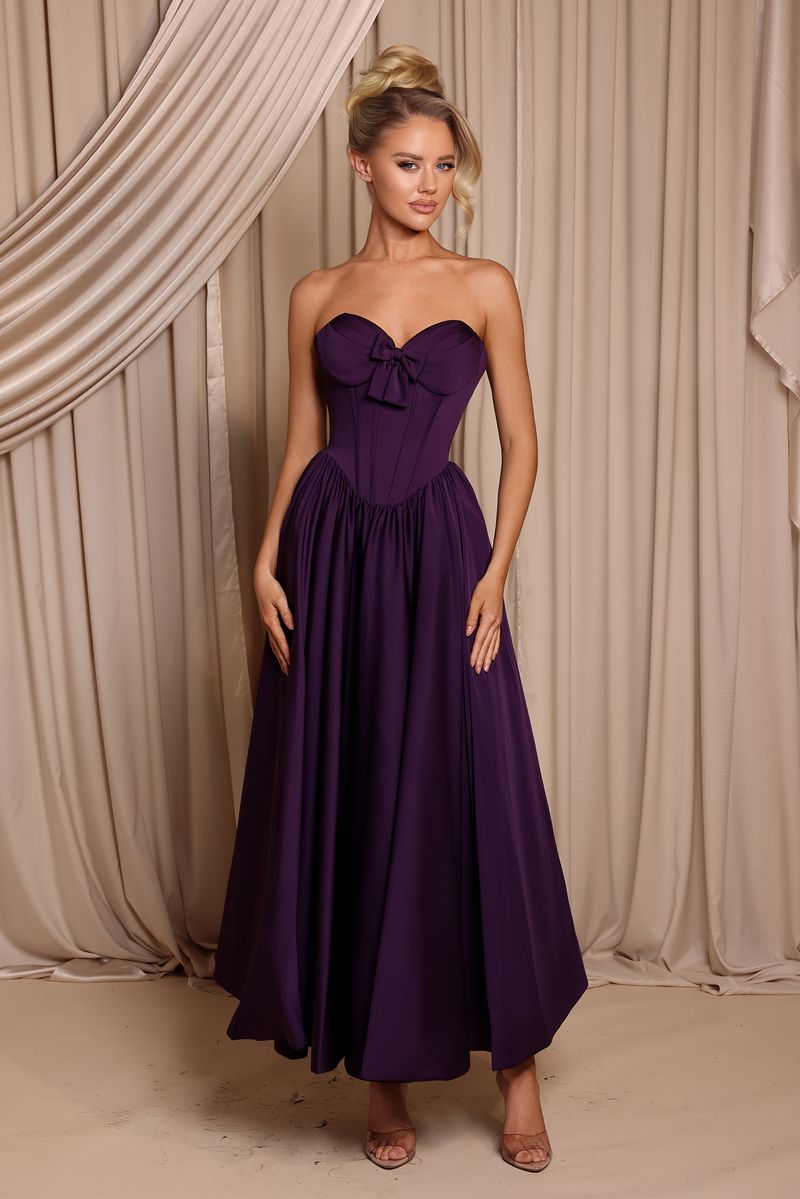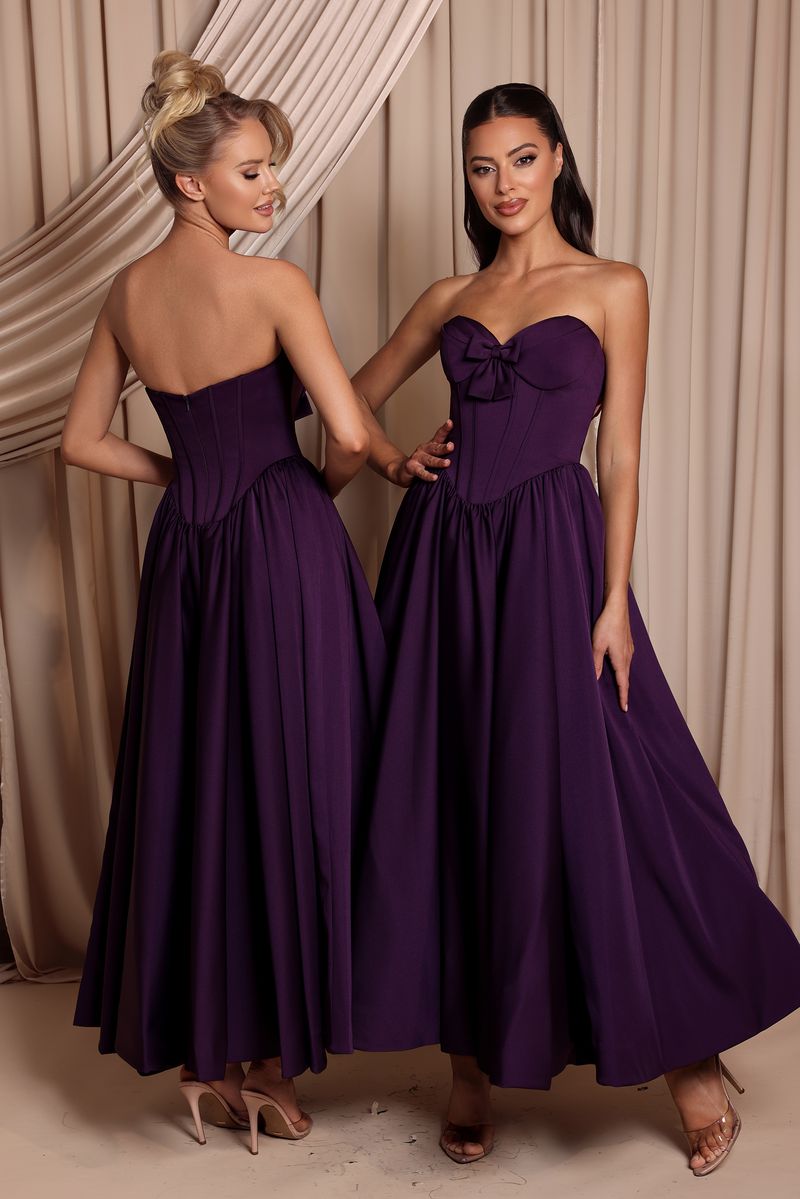 The Emma Gown is crafted from stretch satin and features a structured bodice with visible seam detailing and a sweetheart neckline adorned with a statement bow. The fitted waist flows into a full A-line skirt that moves beautifully with every step. A playful yet elegant gown, perfect for modern bridesmaids..