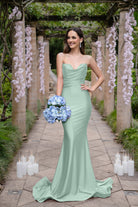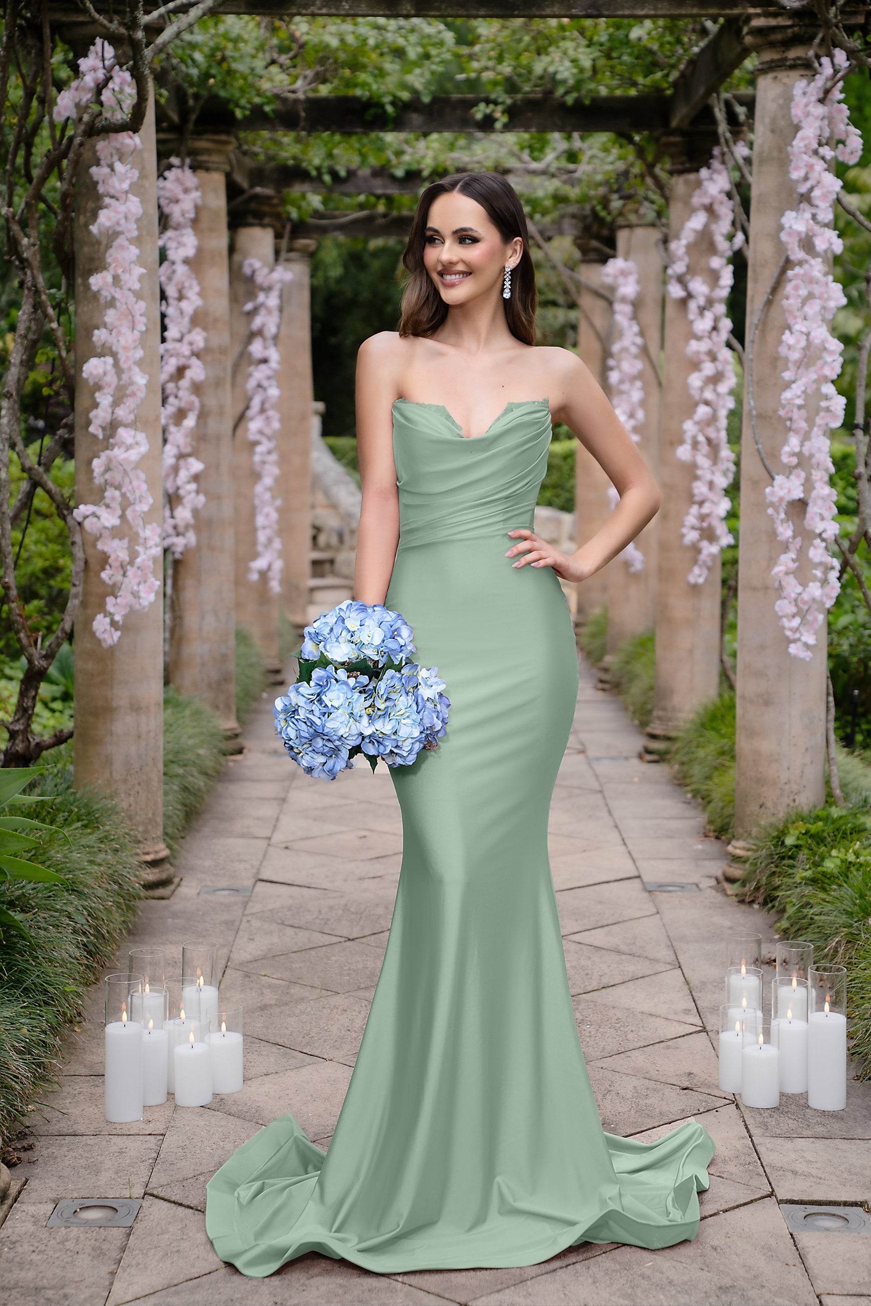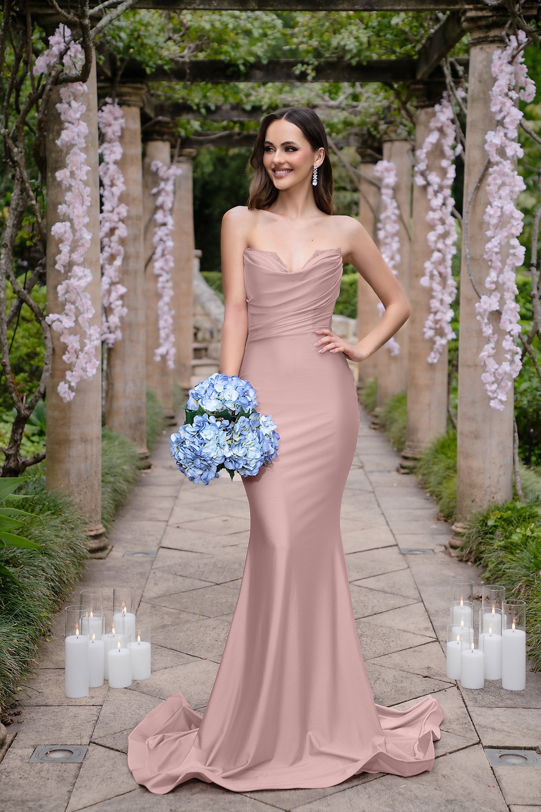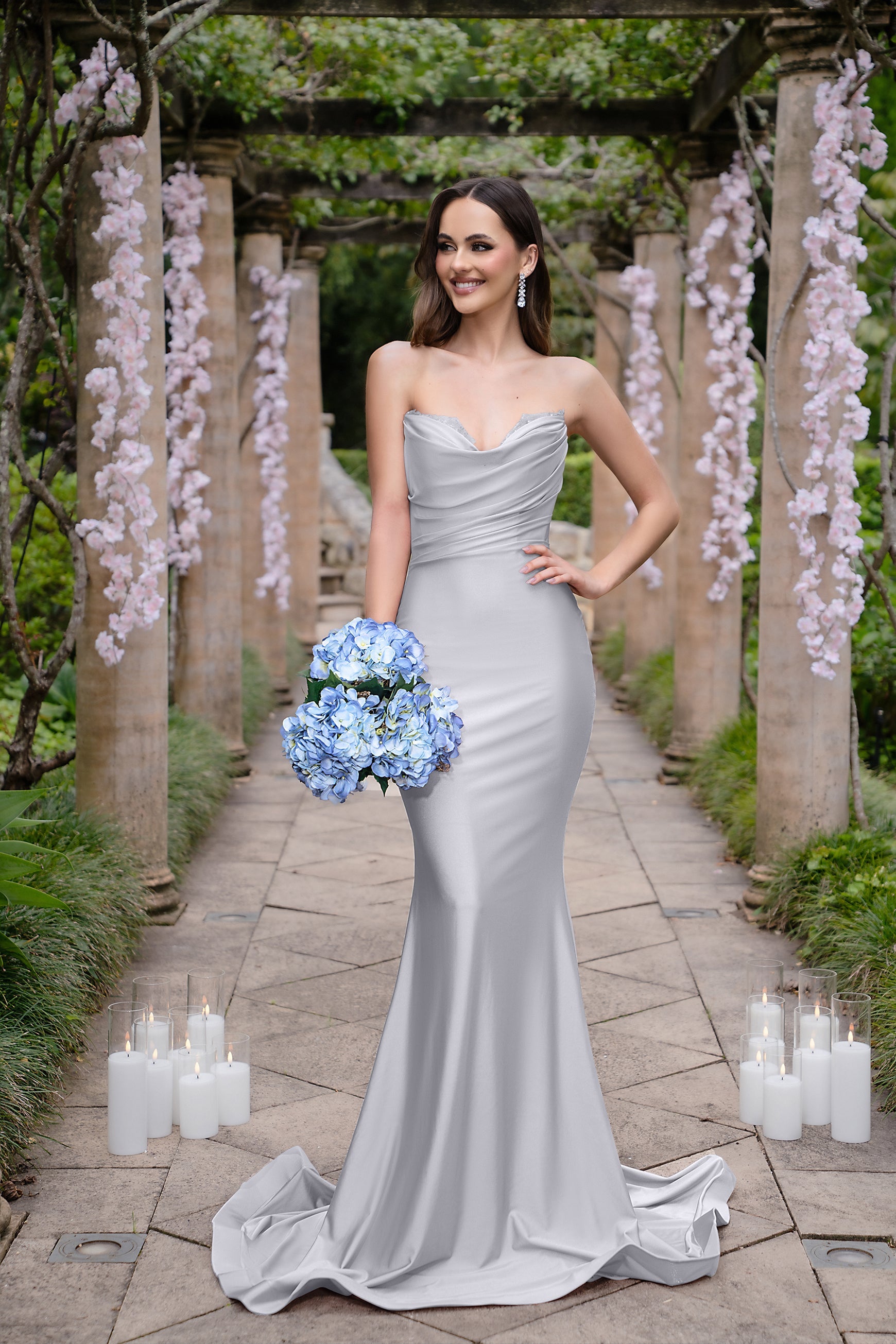 Introducing the Gabriella, a stunning choice for your bridal party that radiates elegance and charm. This strapless, sweetheart-shaped gown features a flattering mermaid silhouette that beautifully hugs the curves and flows into a subtle train at the back. Adorned with exquisite lace trim across the bodice, the Gabriella adds a touch of romance and sophistication. With its high stretch fabric, this gown ensures your bridesmaids will feel comfortable and confident while celebrating your special day. Let the Gabriella be the perfect blend of style and grace for your wedding!