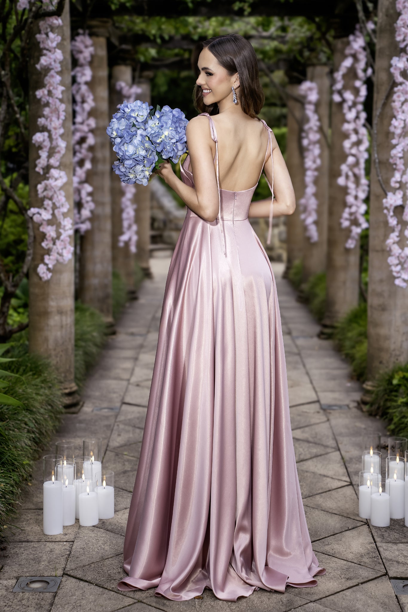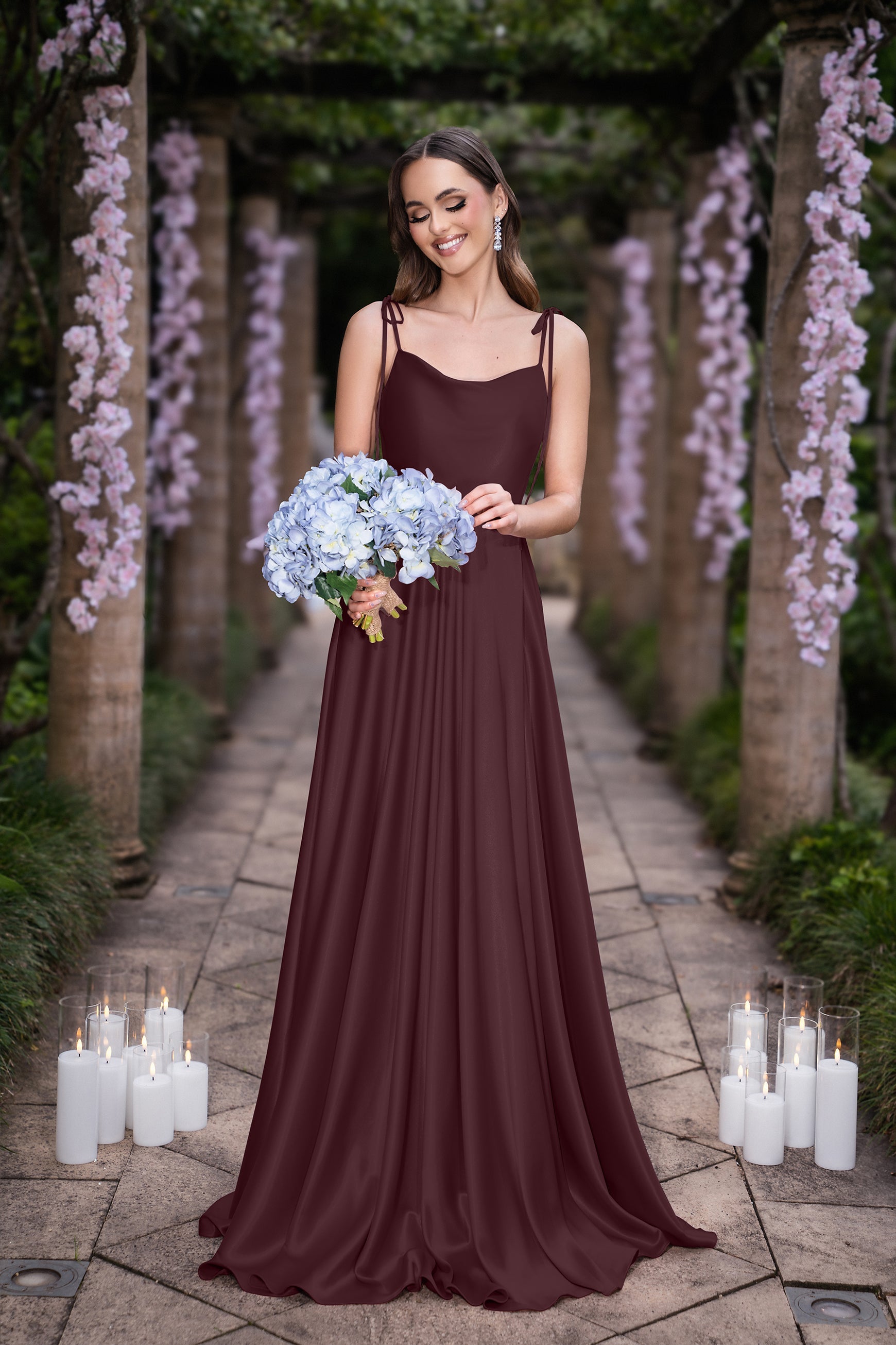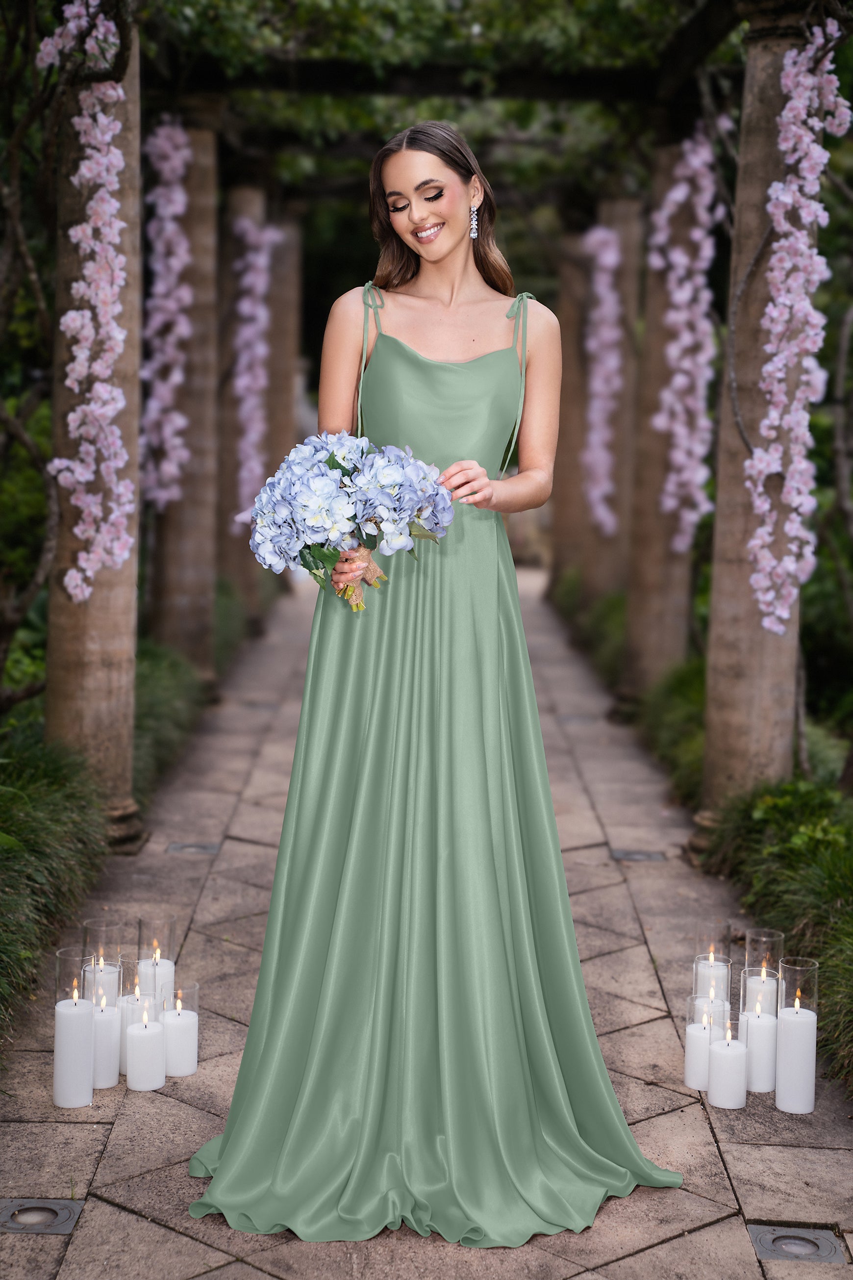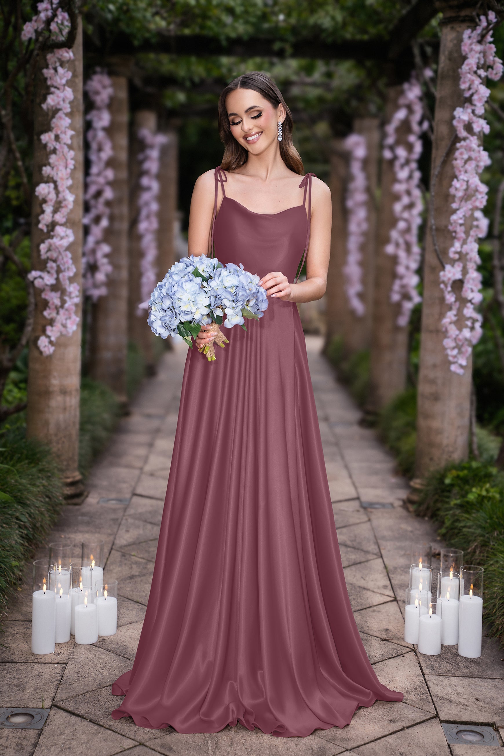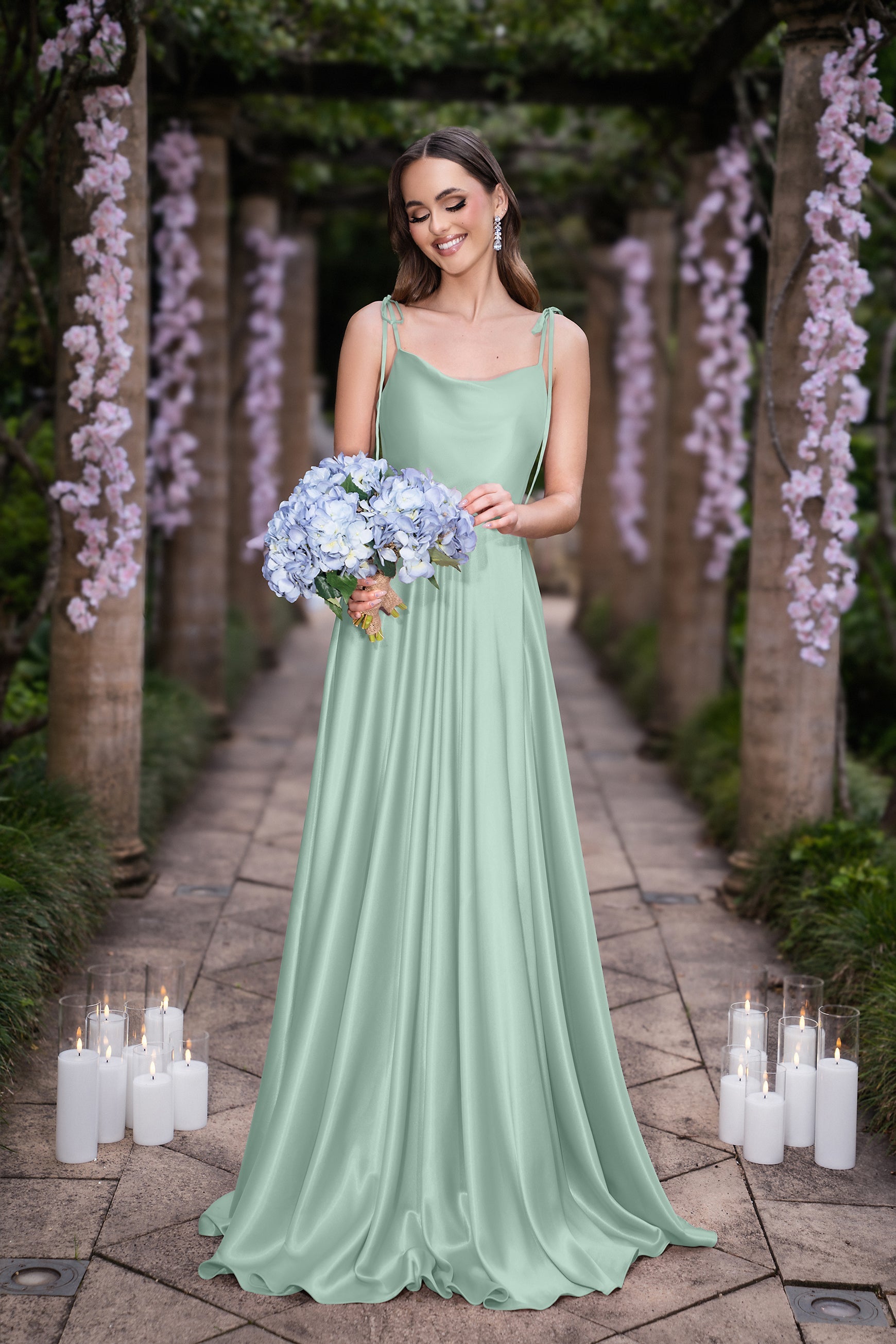 Introducing the Glenda‚ a dreamy, ethereal choice for bridesmaids who adore effortless elegance. This A-line gown features delicate, adjustable tie-up straps for a customizable fit, while the softly draped bodice adds a touch of romance and grace. The flowing, full-length skirt creates a timeless silhouette that flatters every figure, perfect for twirling the night away. Glenda is beautifully structured to ensure a flattering and comfortable fit for all-day wear.