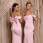The Harper Gown is crafted from stretch satin and features an off-shoulder neckline with folded detailing for a sleek finish. The fitted silhouette highlights the figure, flowing into a soft train, while a statement bow at the back adds a romantic touch. A graceful and feminine choice for modern bridesmaids..