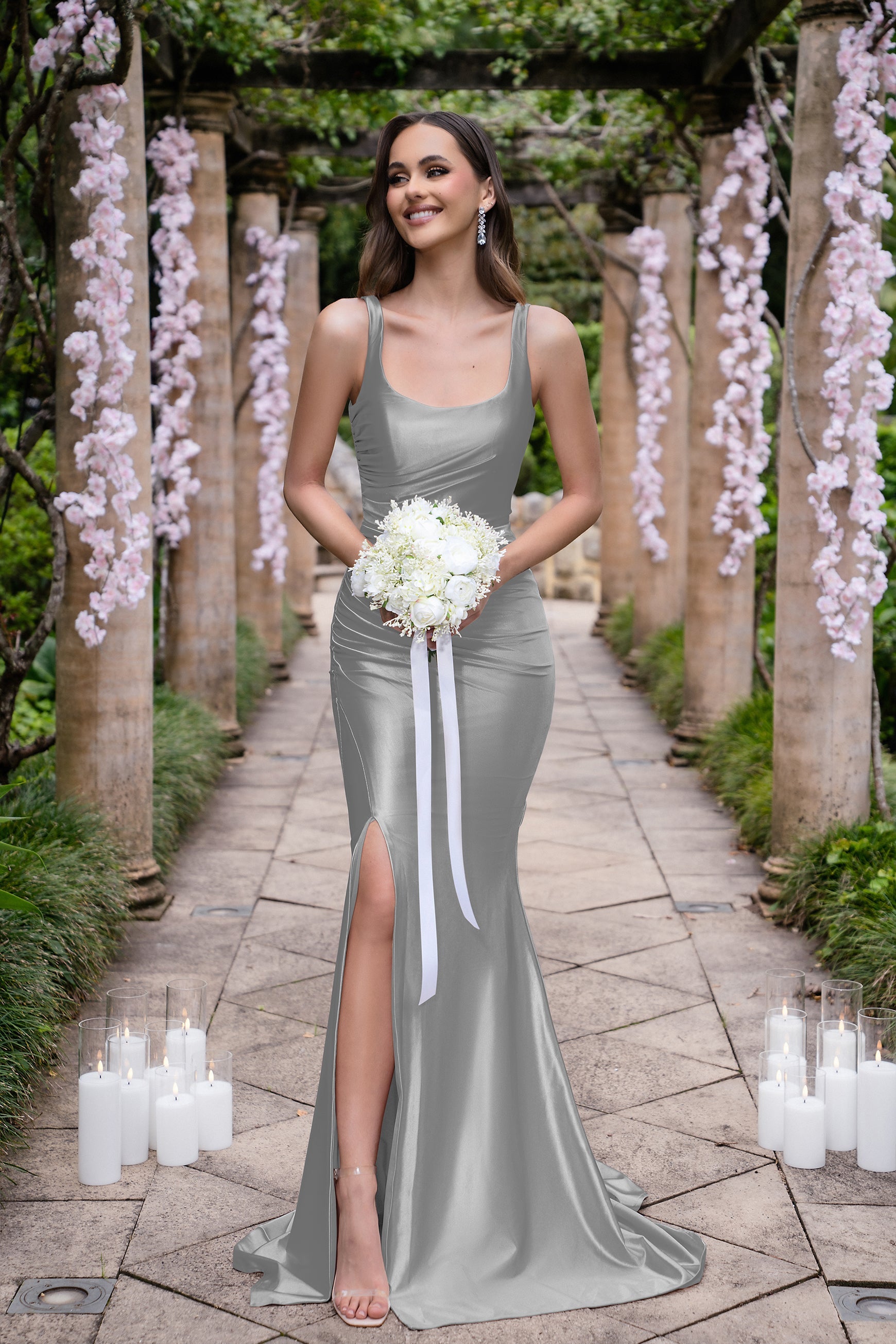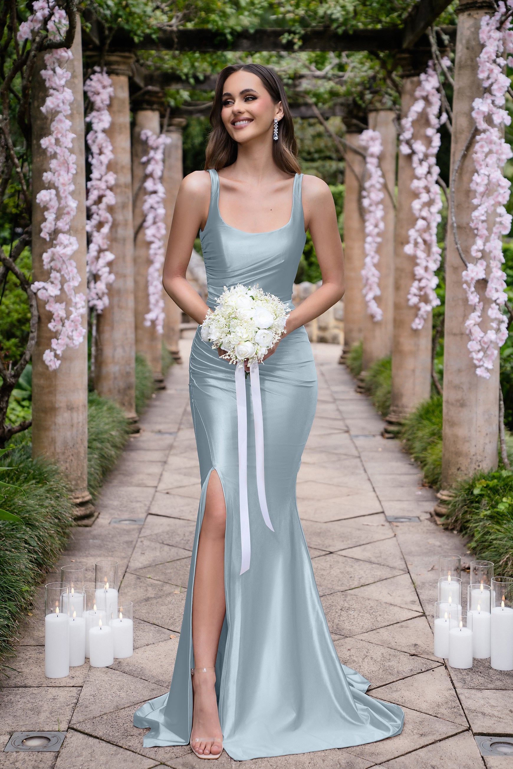 Introducing the Isadora Gown (or PS22228): a breath-taking floor-length masterpiece designed to flatter every bridesmaid. With its elegant scoop neckline and gentle ruching at the hips, this fitted bridesmaids dress creates a stunning silhouette that moves beautifully. The alluring curved side slit adds a touch of modern sophistication, while the medium stretch fabric ensures comfort and ease of movement throughout the celebration. This fitted bridesmaids dress is perfect for a bride who wants her bridesmaids to look and feel their best on her special day. The scoop neckline adds a touch of elegance, while the gentle ruching at the hips creates a flattering silhouette for all body types. Whether your bridesmaids are petite or curvy, this dress is designed to complement and enhance their natural beauty.