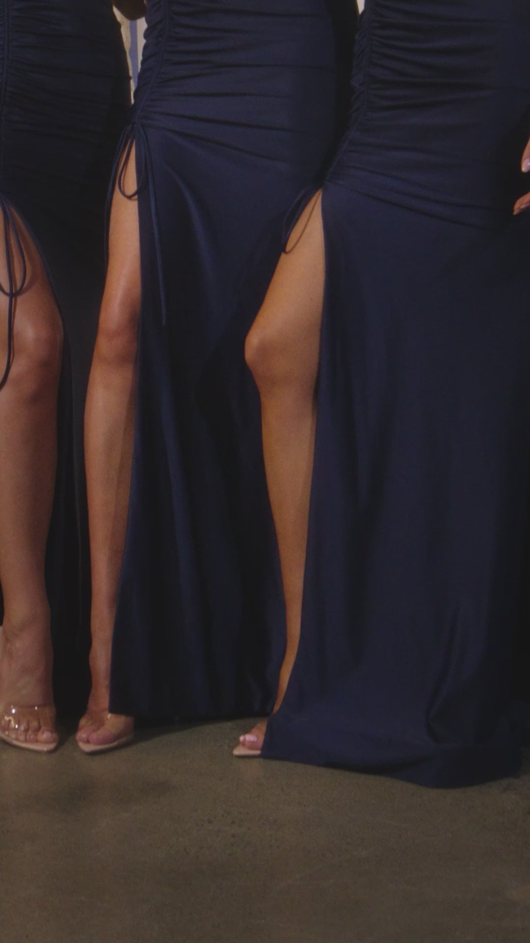 Introducing the Issa, a beautifully sleek design perfect for your bridesmaids. Featuring delicate thin straps, flattering ruching across the bodice and waist, and a daring high slit, this gown exudes elegance and confidence. Made from soft, stretchy jersey fabric with medium to high stretch, the Issa offers a comfortable yet stunning fit‚ making it the ideal choice for a chic and memorable look on your special day.