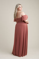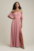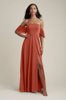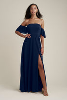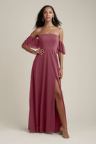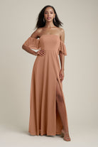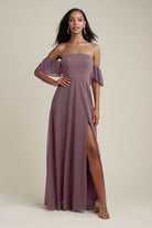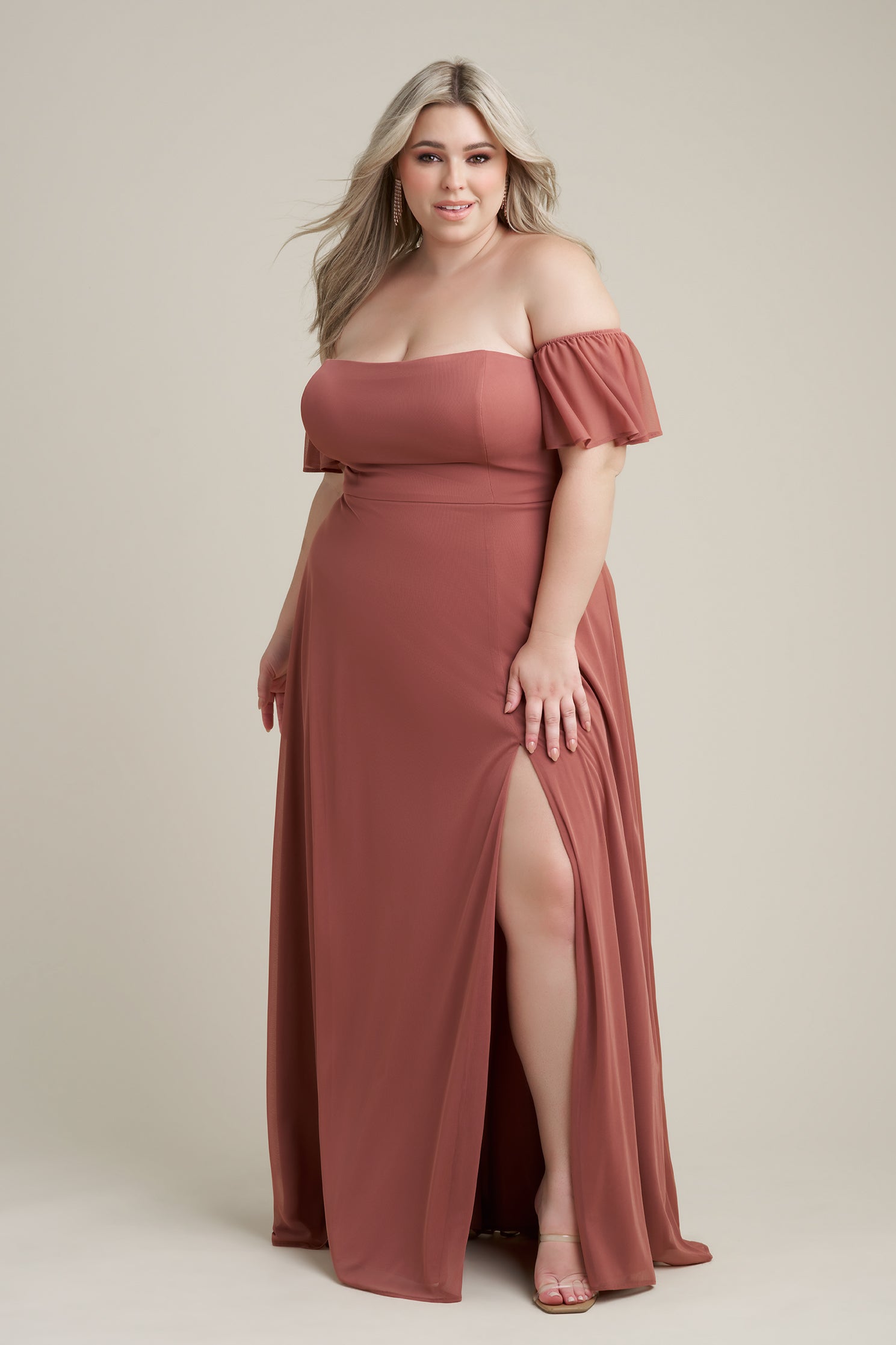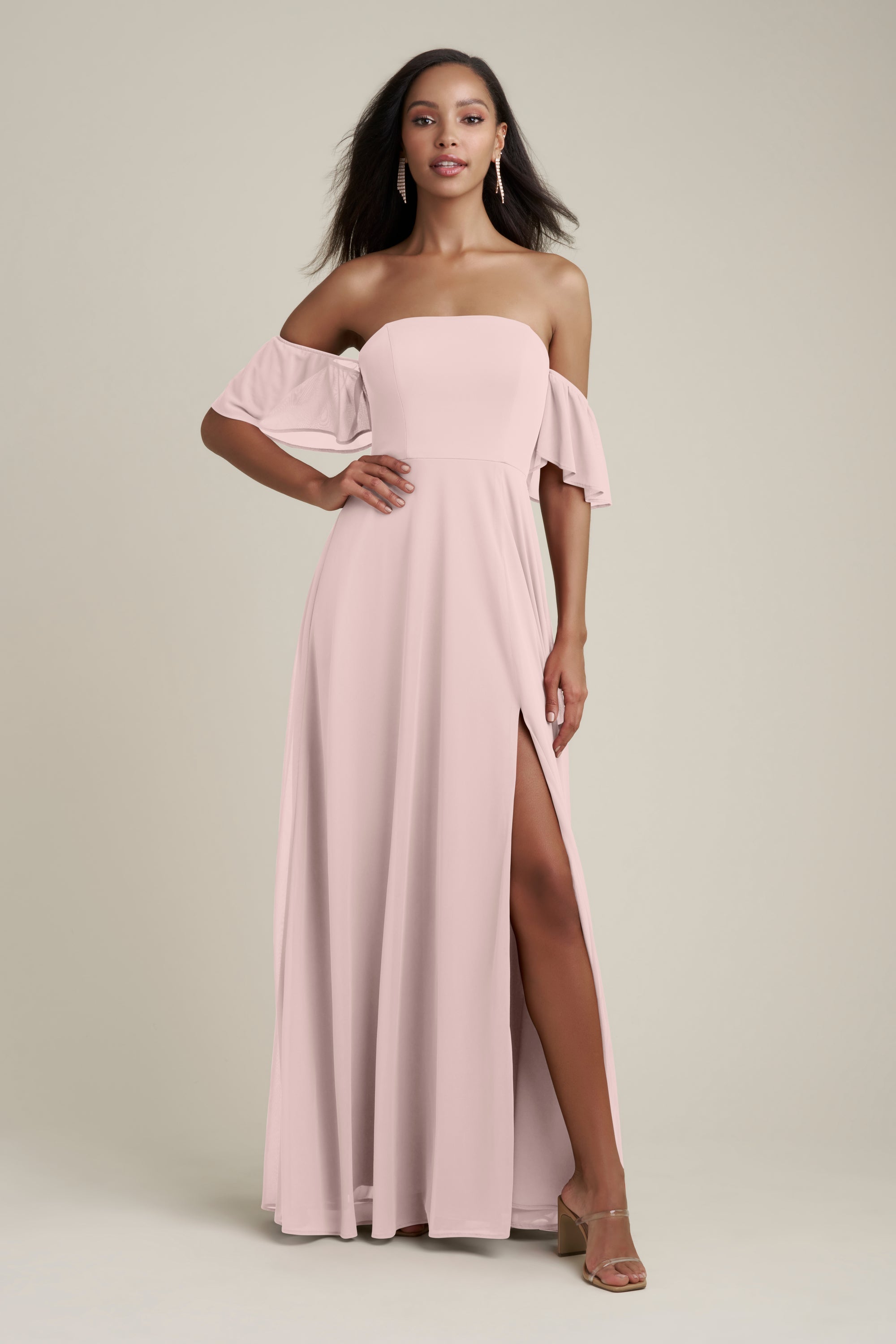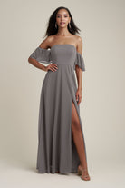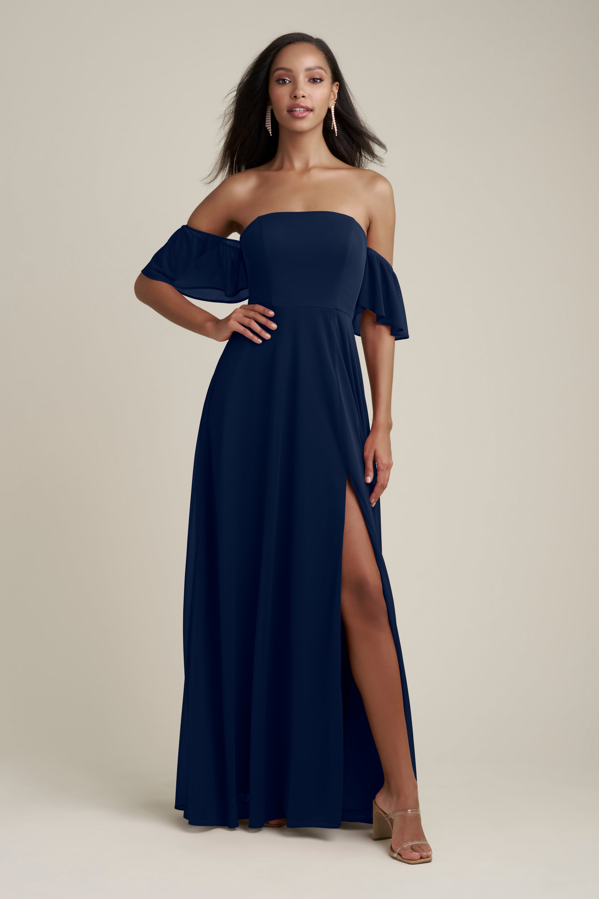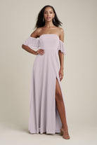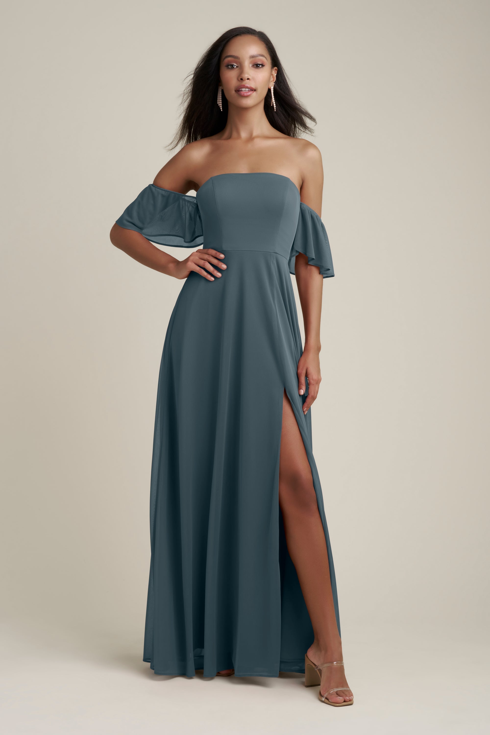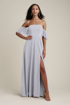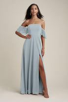 Lee's classic A-line silhouette is given subtly dramatic flair with off-shoulder ruffle sleeves and a striking thigh-high slit.