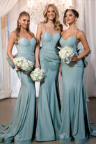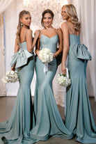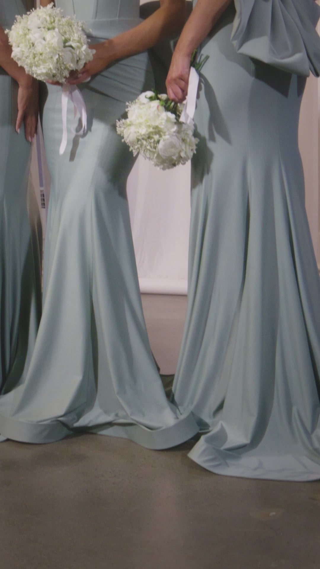 Introducing the Marisa, a timeless and elegant choice for your bridesmaids. This form-fitting design features delicate thin straps, a beautifully structured bodice with visible boning details, and flattering ruching that extends from the waist to the hips, creating a stunning silhouette. The gown is finished with a detachable bow at the back, adding a touch of drama and charm, while the slight train brings a graceful, sophisticated finish. Crafted from luxurious jersey fabric with medium to high stretch, the Marisa ensures both comfort and style.