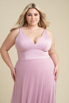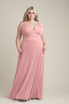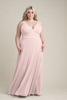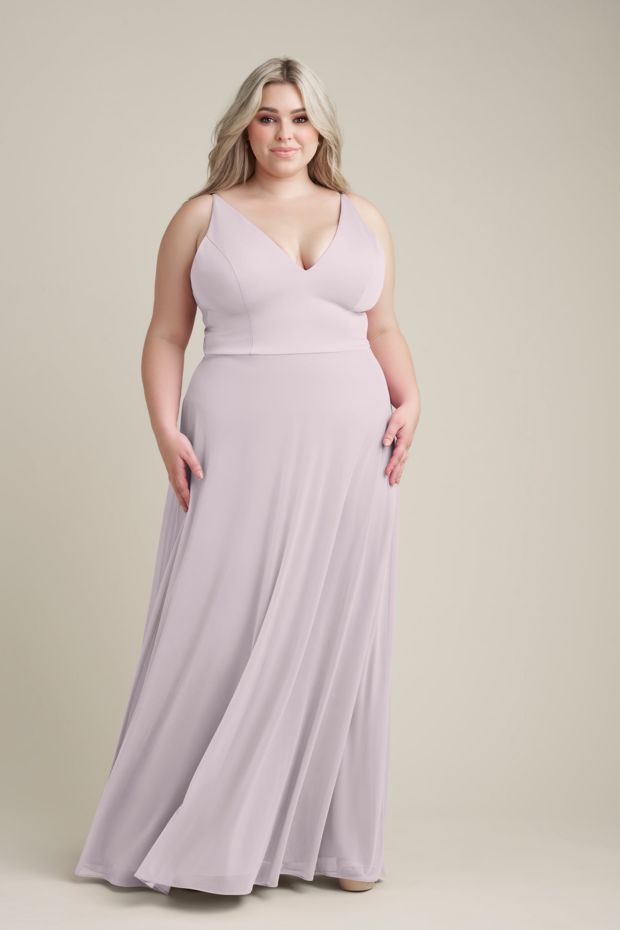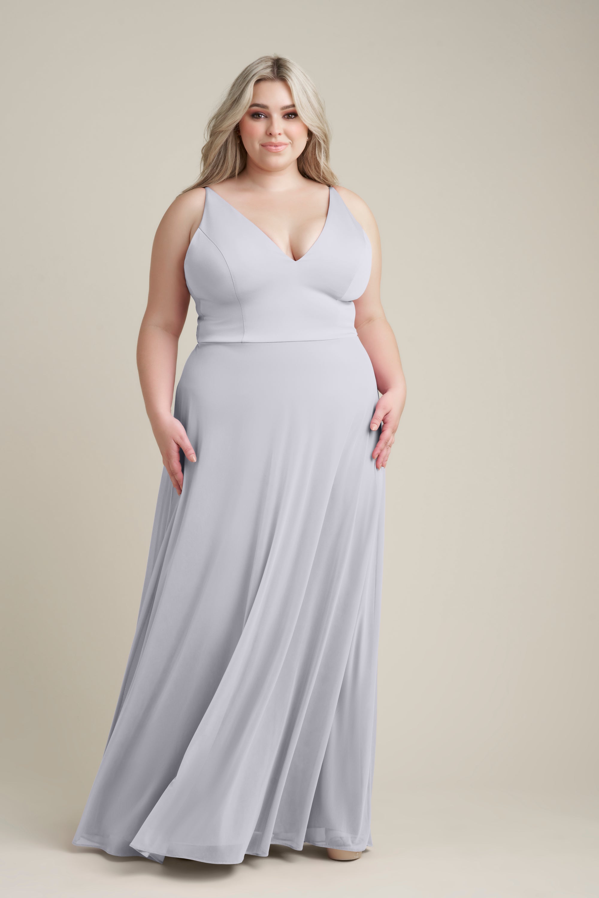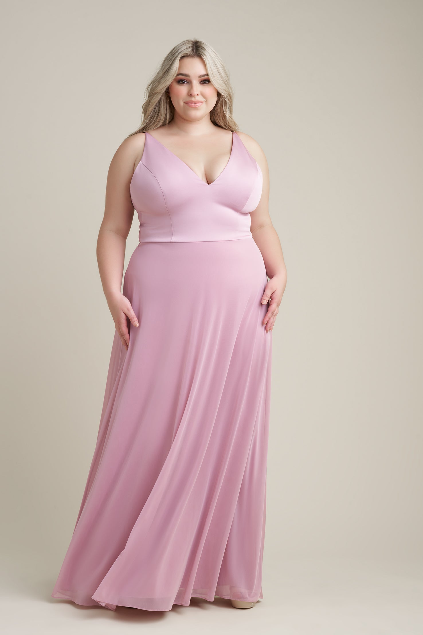 Dreamy Pearl features a V-neck stretch jersey bodice and tie back, leading to an ethereal chiffon A-line skirt.