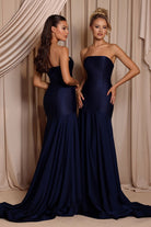 The Riley Gown is designed with a satin bodice and jersey skirt, offering both structure and stretch for a comfortable fit. This strapless style features a smooth, fitted silhouette that flares into a mermaid-style hem with a sweeping train. Elegant and sleek, it’s a modern choice for bridesmaids or formal events.