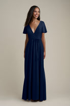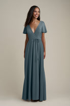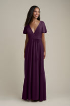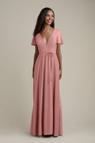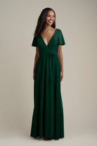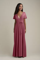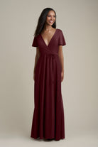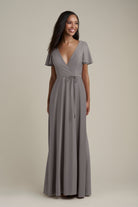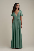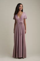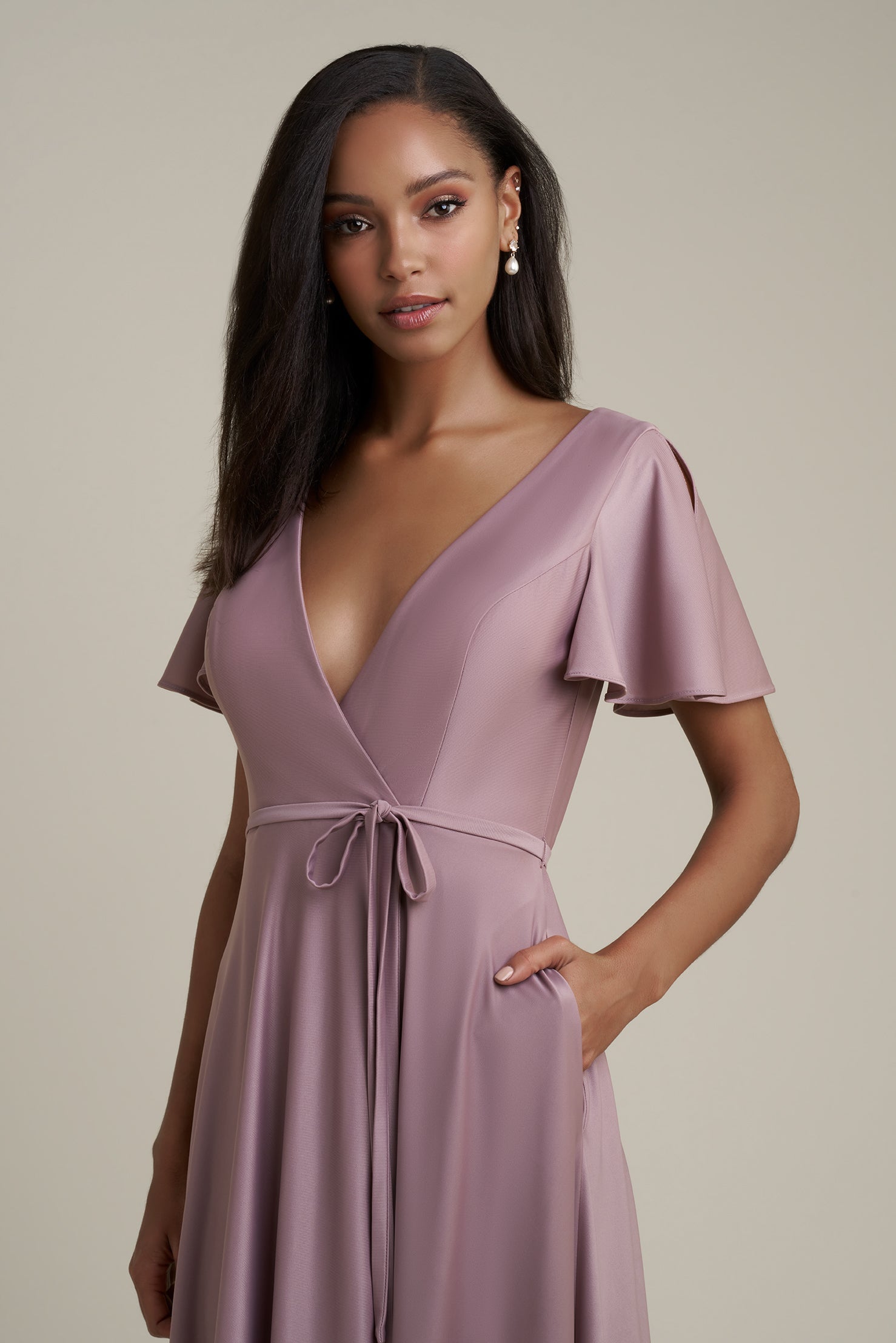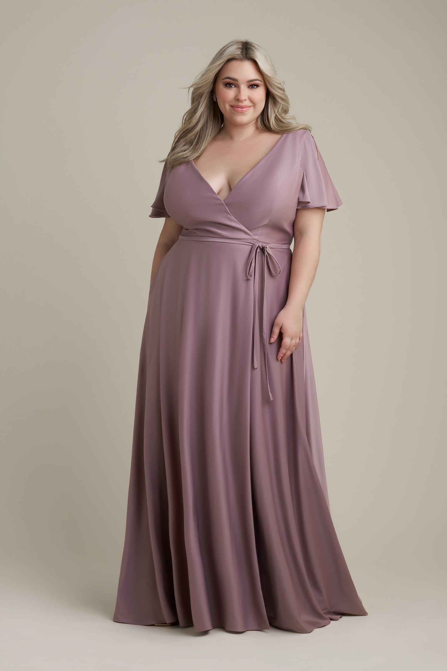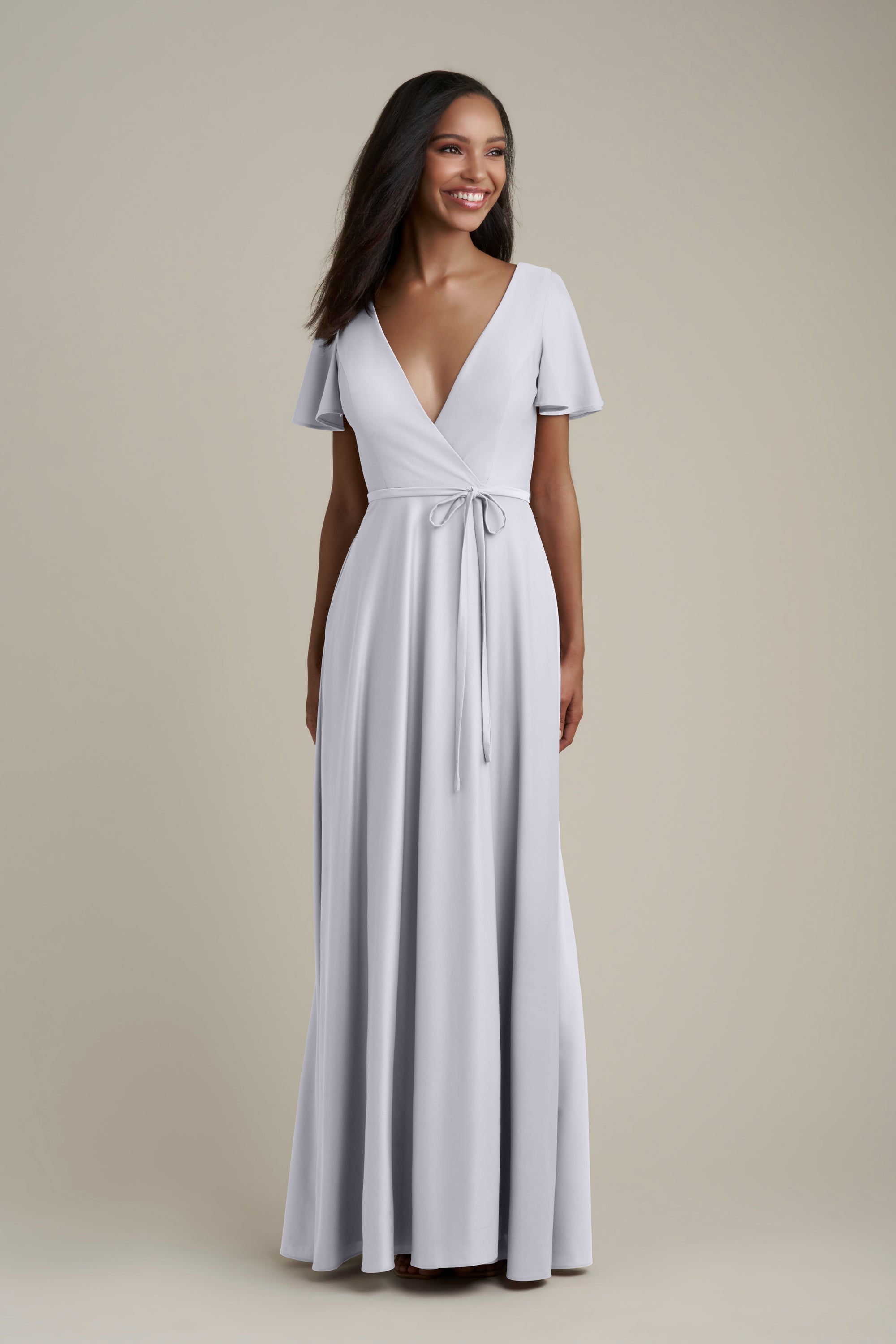 Fluttering sleeves, a faux wraparound bodice and petite bow at the waist lend a balletic grace to the lovely Sylvia gown.